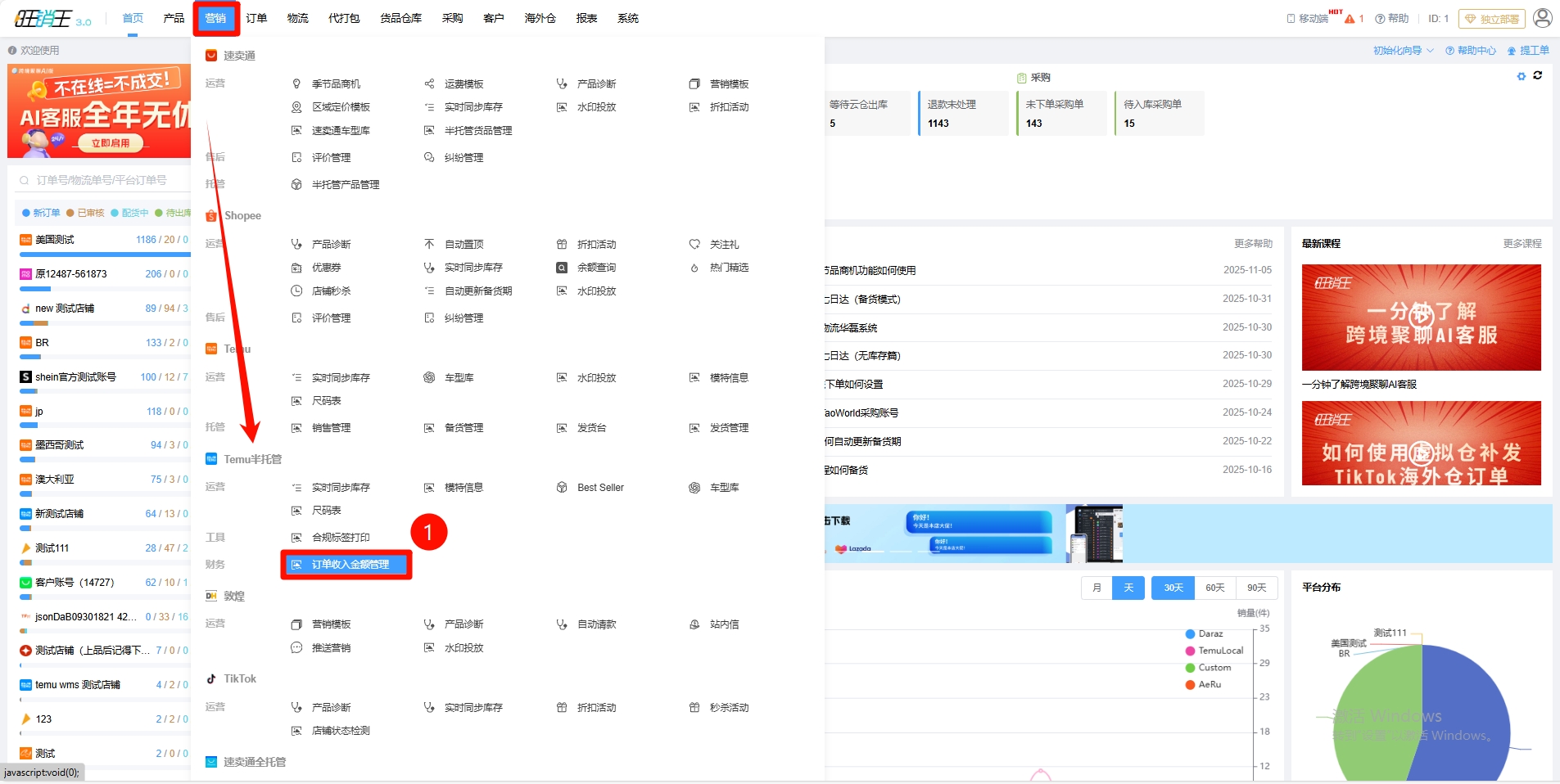 第一步:点击营销 -> 找到Temu半托管 -> 点击订单金额管理
