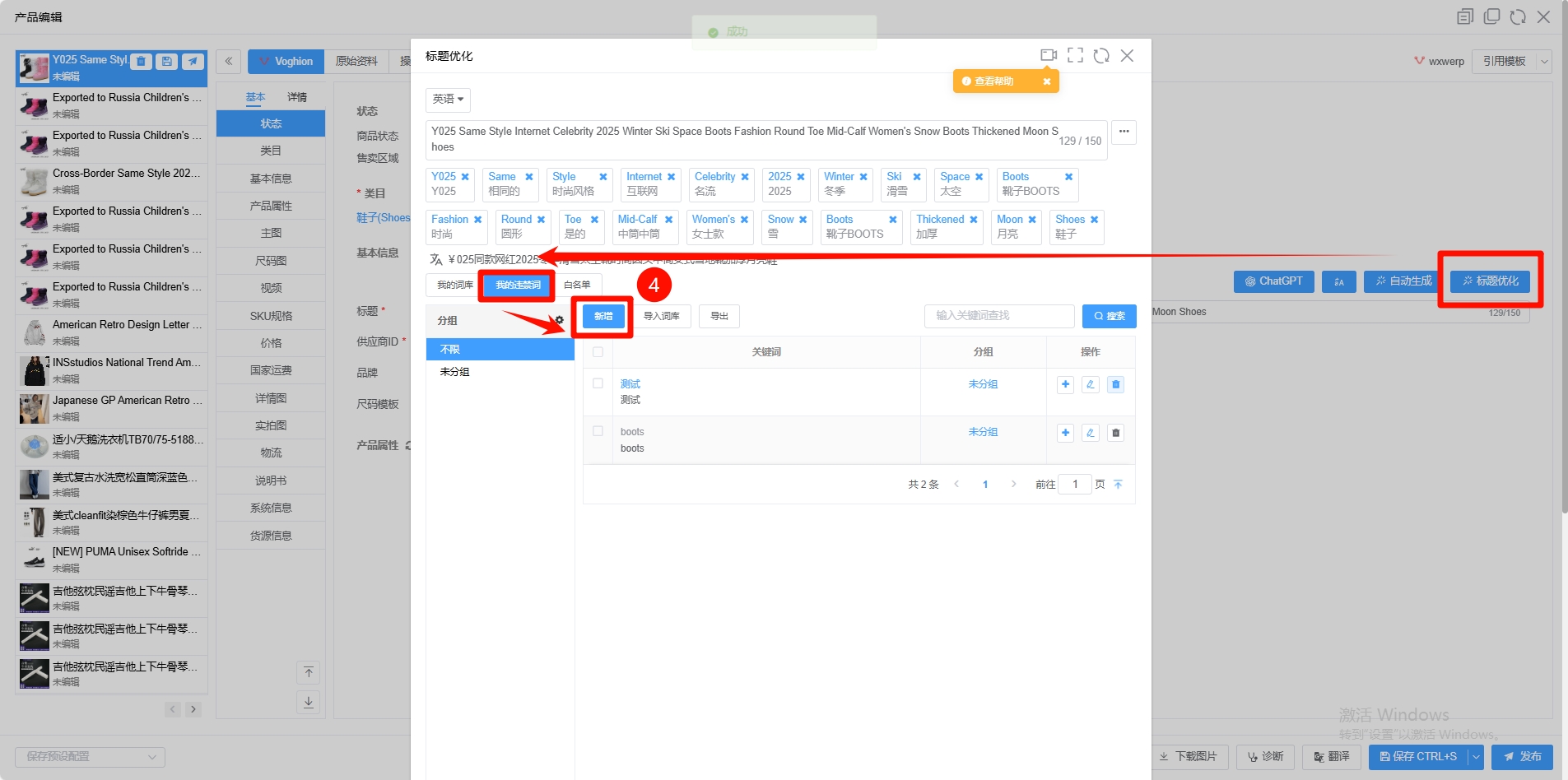 第四步:点击标题优化 -> 进入我的违禁词 -> 点击新增