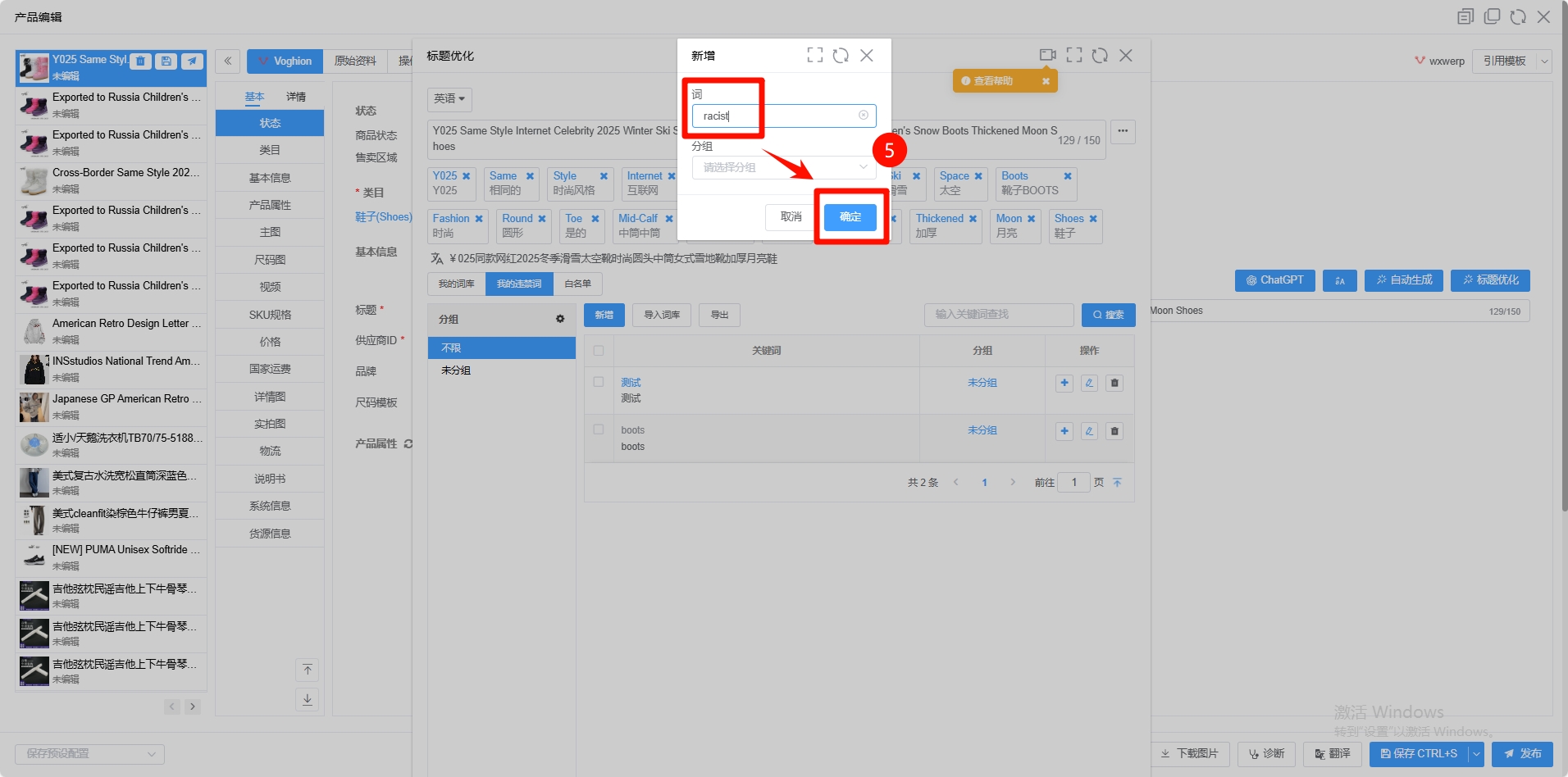 第五步:输入不想在标题中出现的词,如racist -> 点击新增