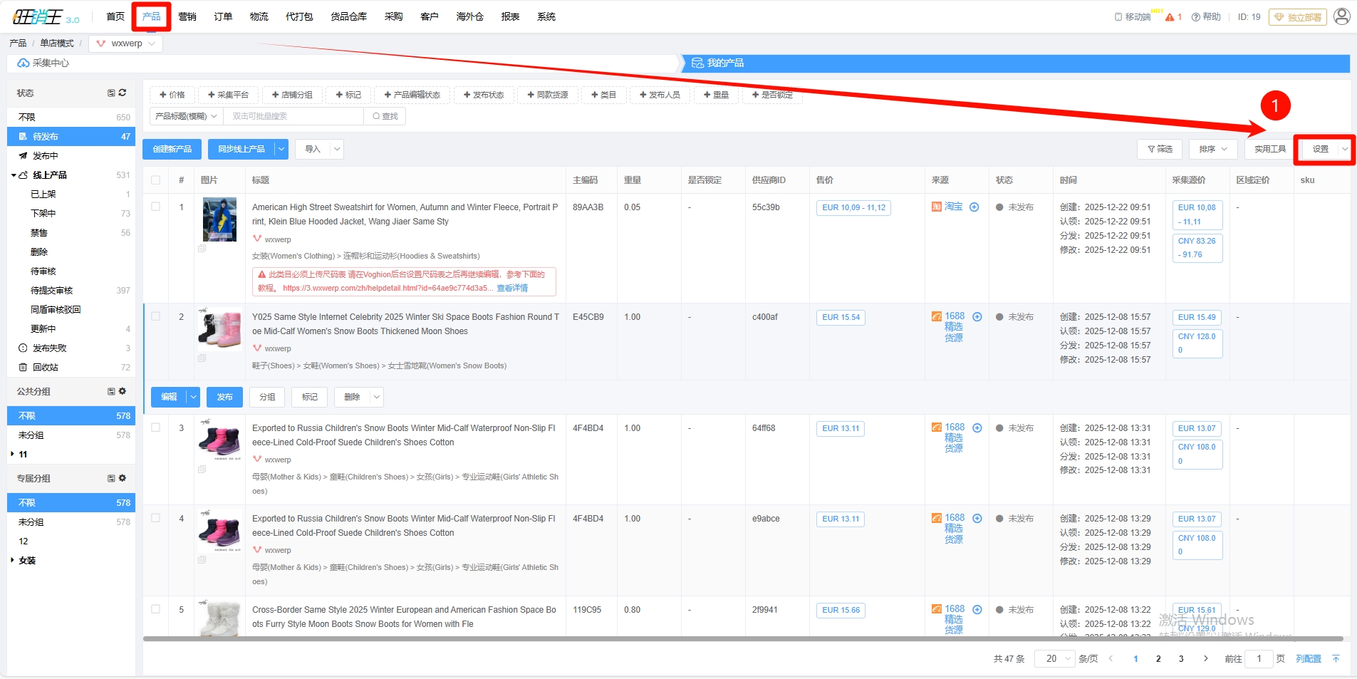 第一步:点击产品 -> 点击右上角设置