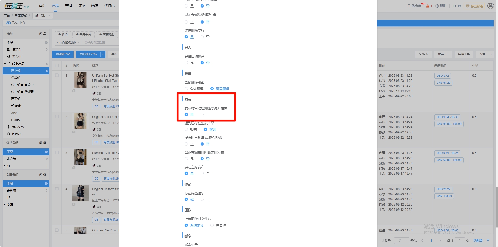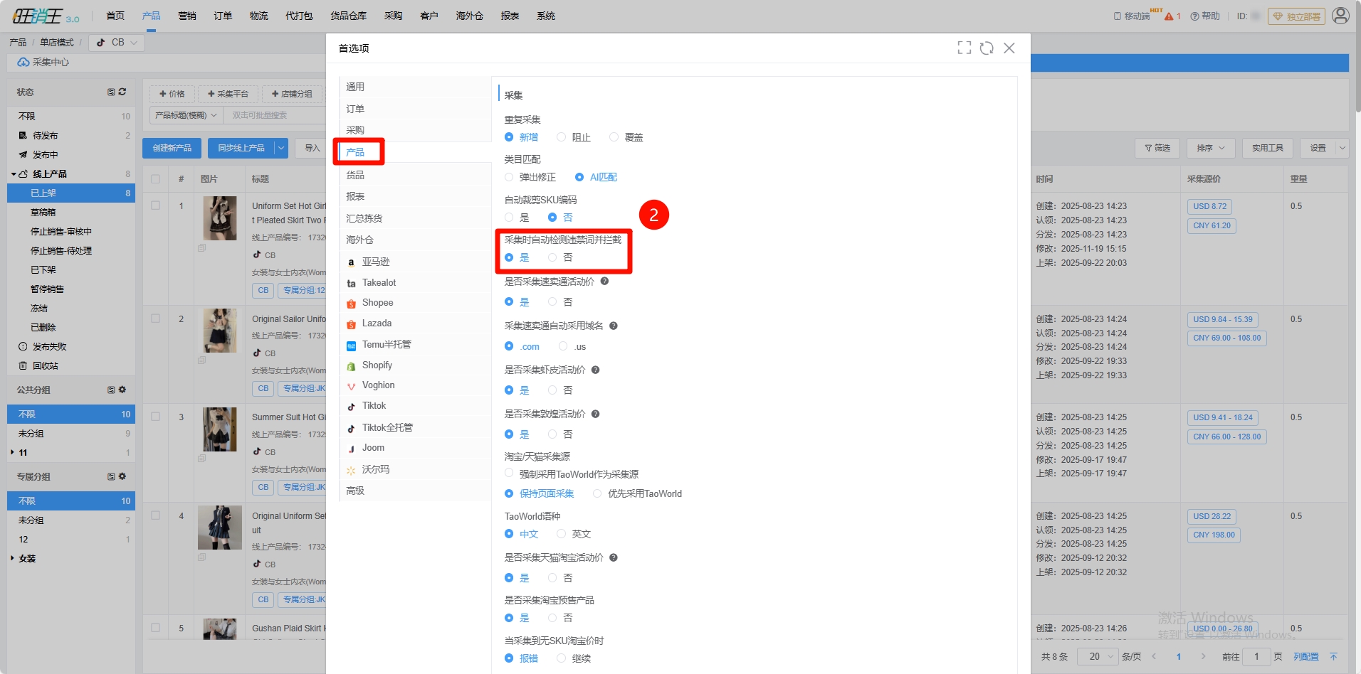 第二步:选择产品 -> 将违禁词判断开启