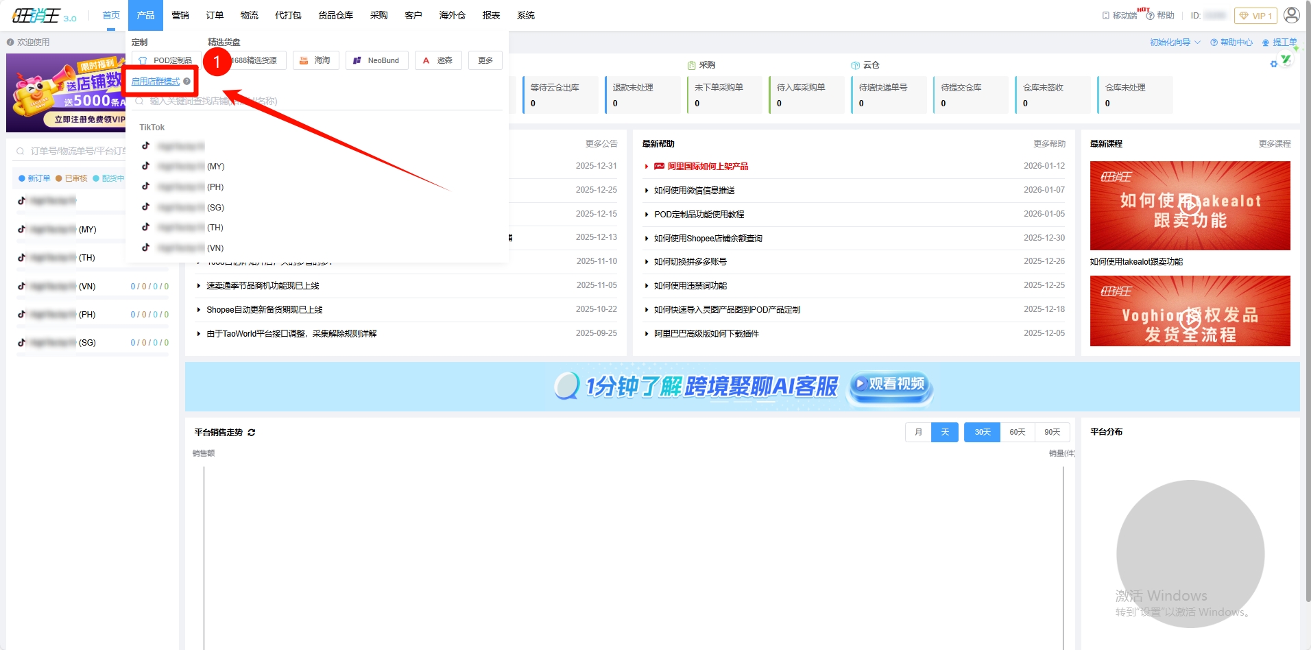 第一步:点击产品 -> 找到启用店群模式并开启