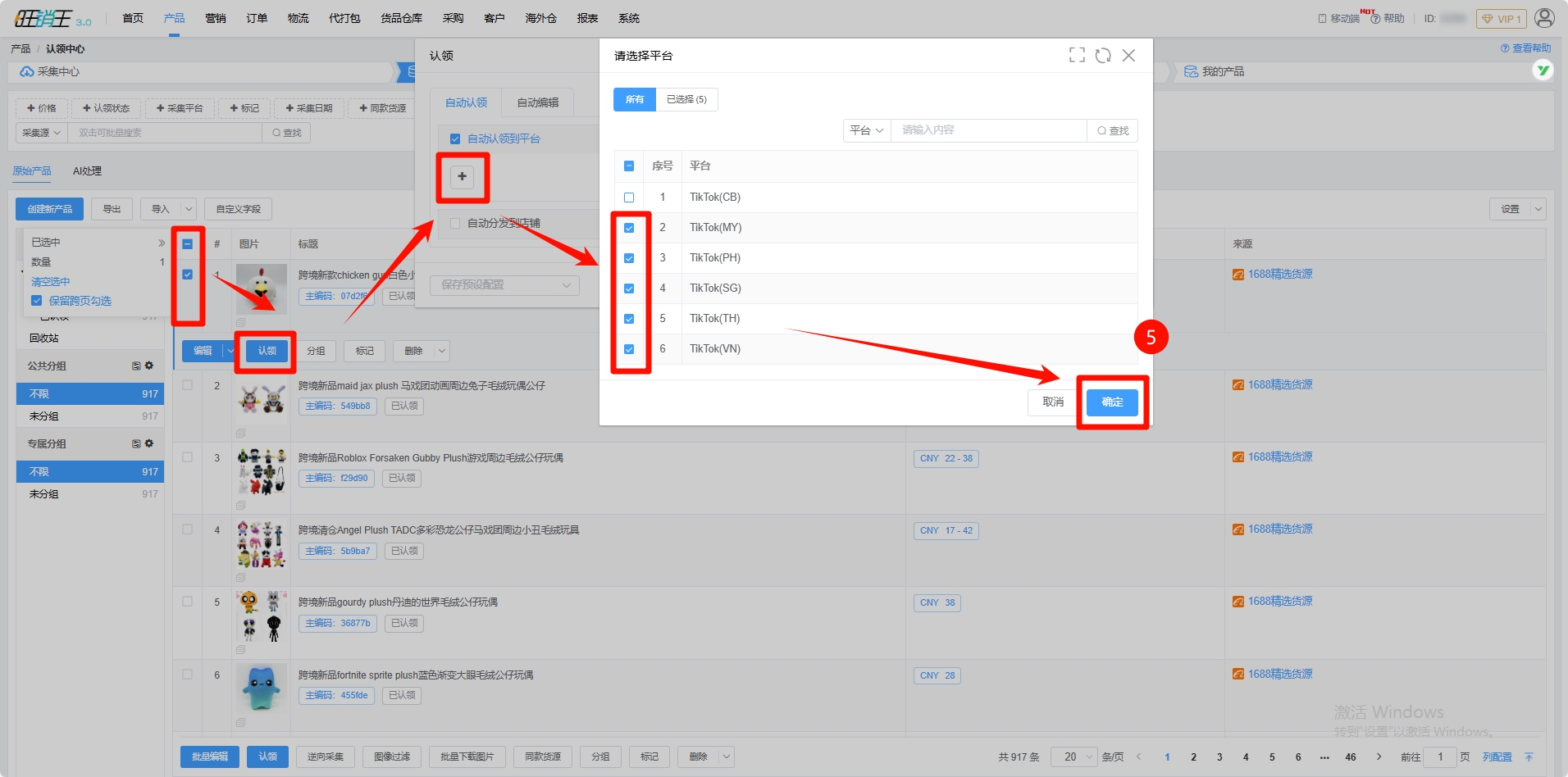 第五步:勾选需要进行认领的产品 -> 点击自动认领到平台 -> 选择对应站点 -> 点击确定
