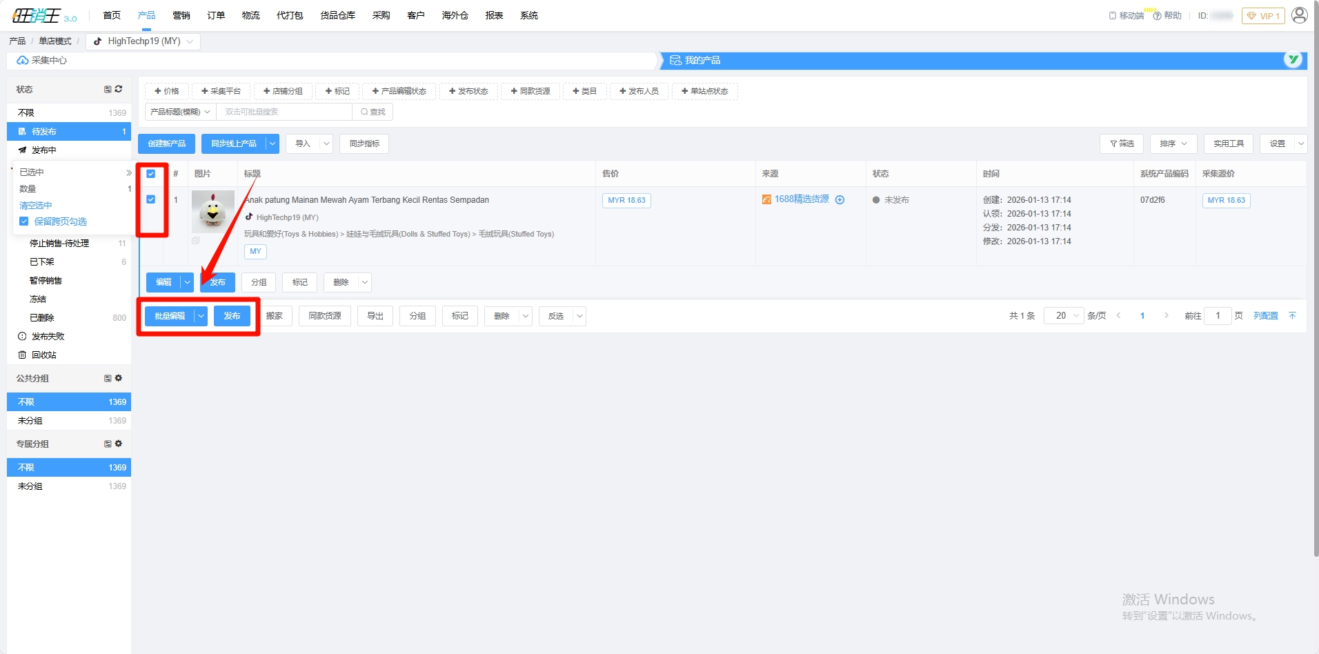第十步:各位商家也可以勾选多个产品 -> 点击批量编辑 或 点击批量发布 ,进行产品的批量发布。