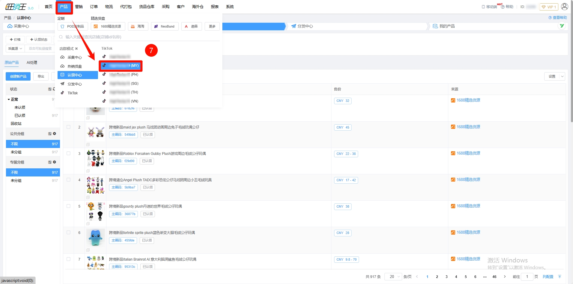 第七步:点击产品 -> 找到产品认领到的对应店铺