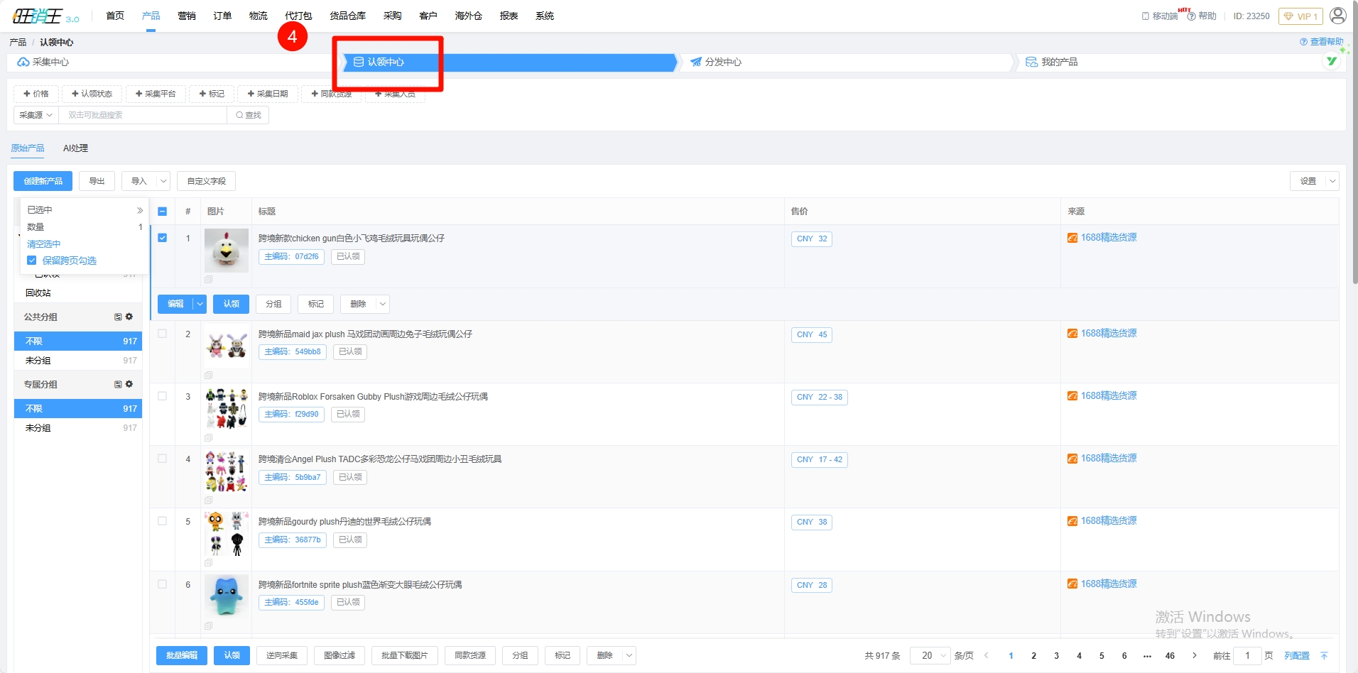 第三步:点击采集中心,从此处采集产品。(店群模式下采集的产品将会直接进入认领中心)