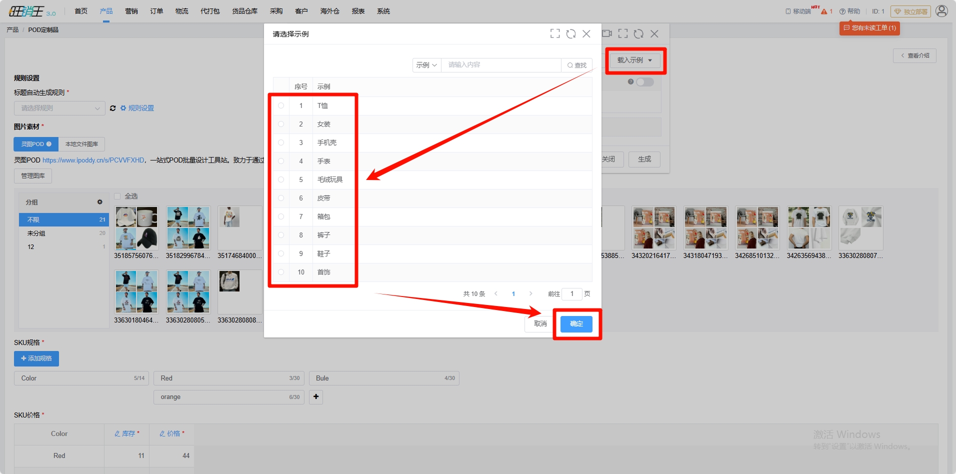点击载入示例 -> 选择对应品类 -> 点击确定