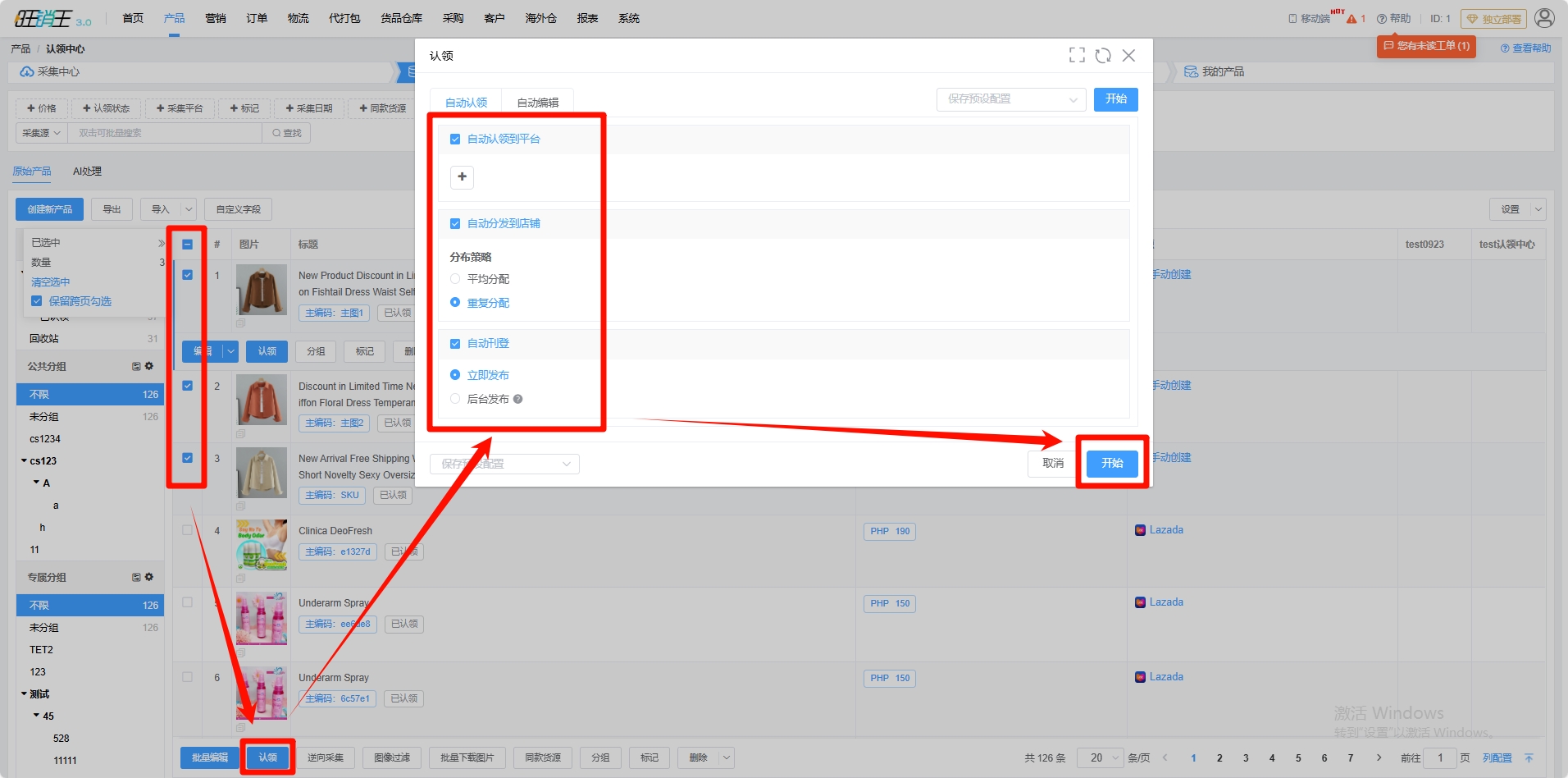 即可看到已经创建好的产品了。各位商家可以勾选对应产品 -> 点击认领 -> 选择对应平台及店铺 -> 点击开始,即可将产品认领到自己的对应店铺。