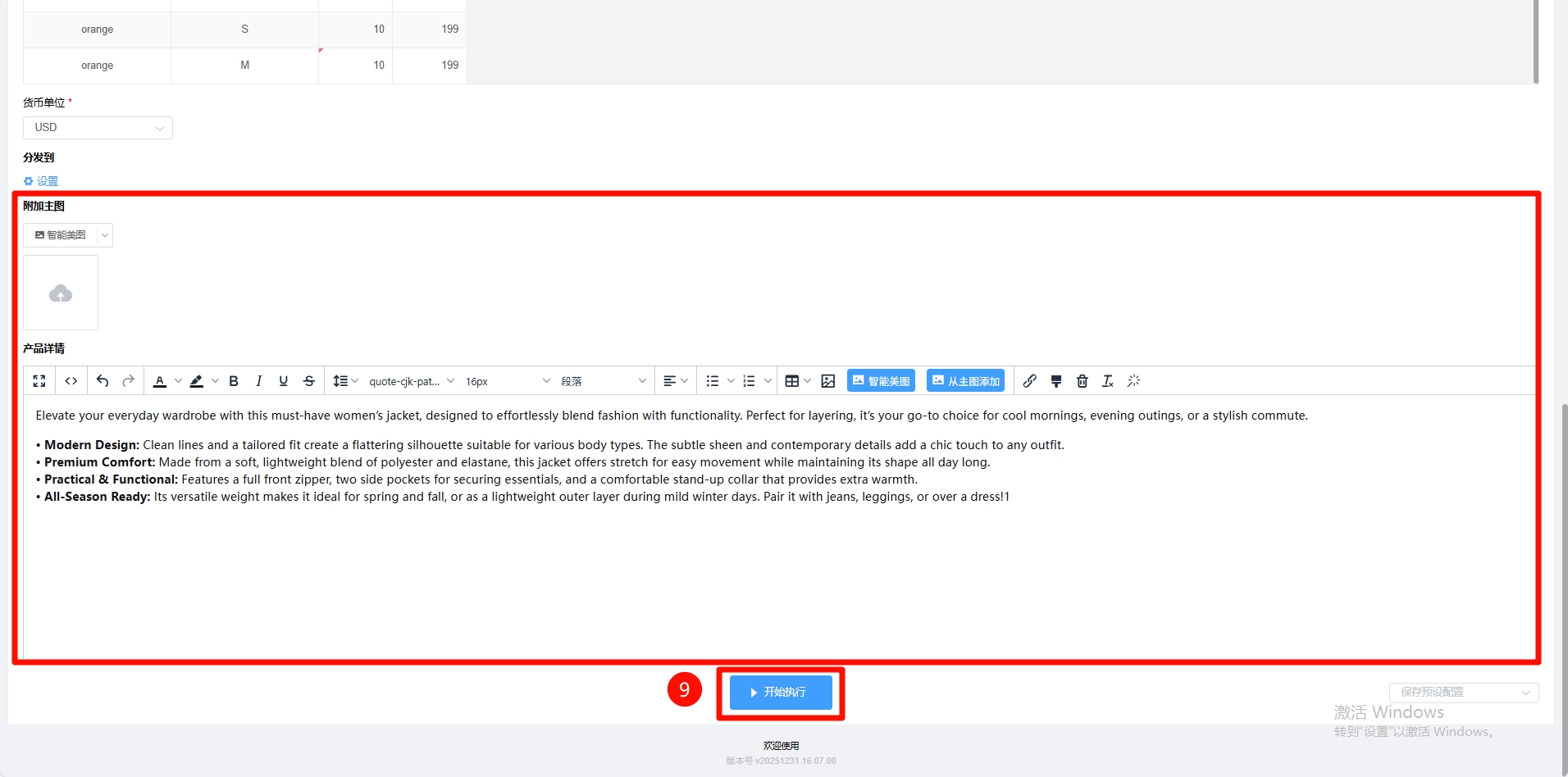 第九步:若各位商家需要添加附加主图及填写产品详情,可在填写完后点击开始执行