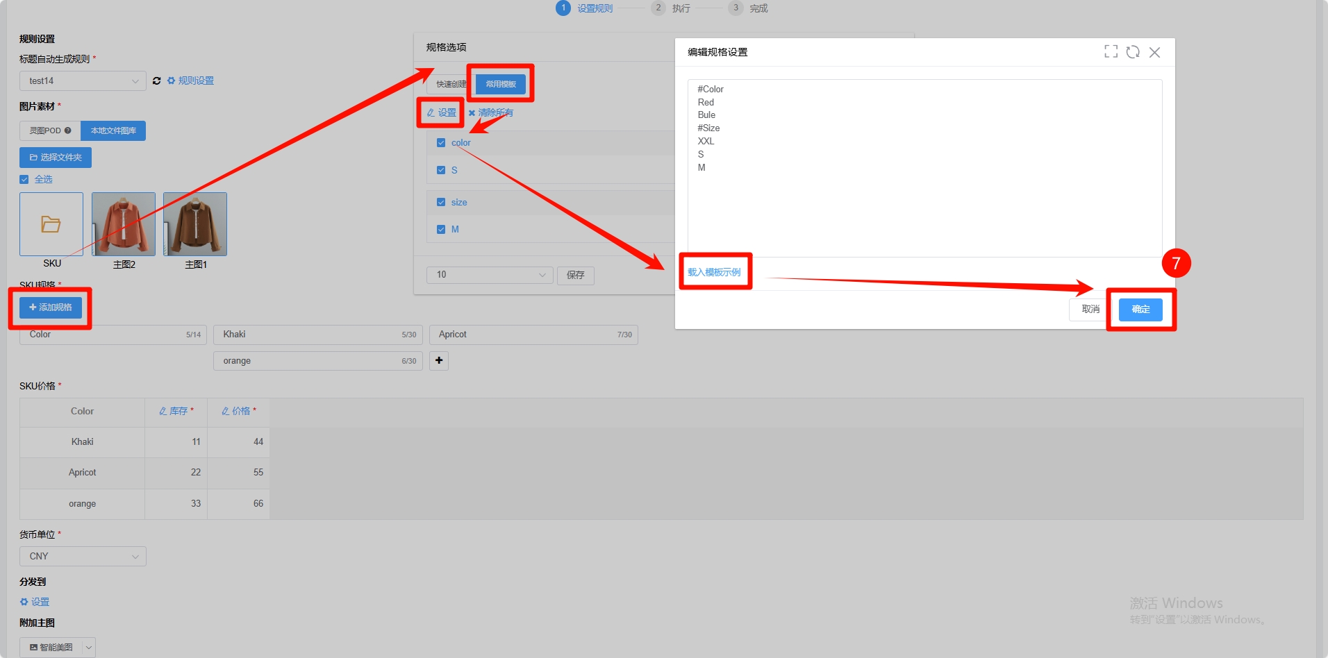 第七步:若各位商家没有放入相关SKU的图片,可以点击添加规格 -> 进入常用模板 -> 点击设置 -> 点击载入模板示例 -> 点击确定,即可快速导入产品规格