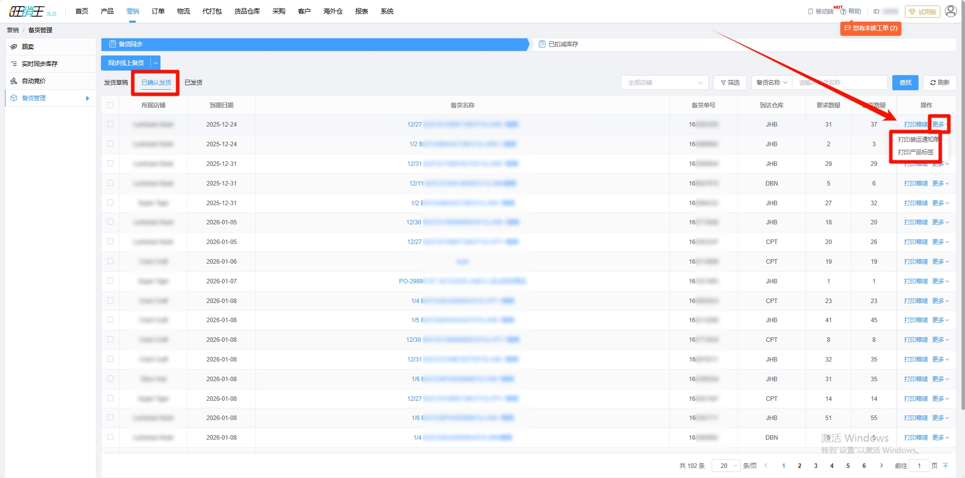 各位商家也可以进入【已确认发货】中,点击打印箱唛,以及点击【更多】,打印装运通知单及产品标签。
