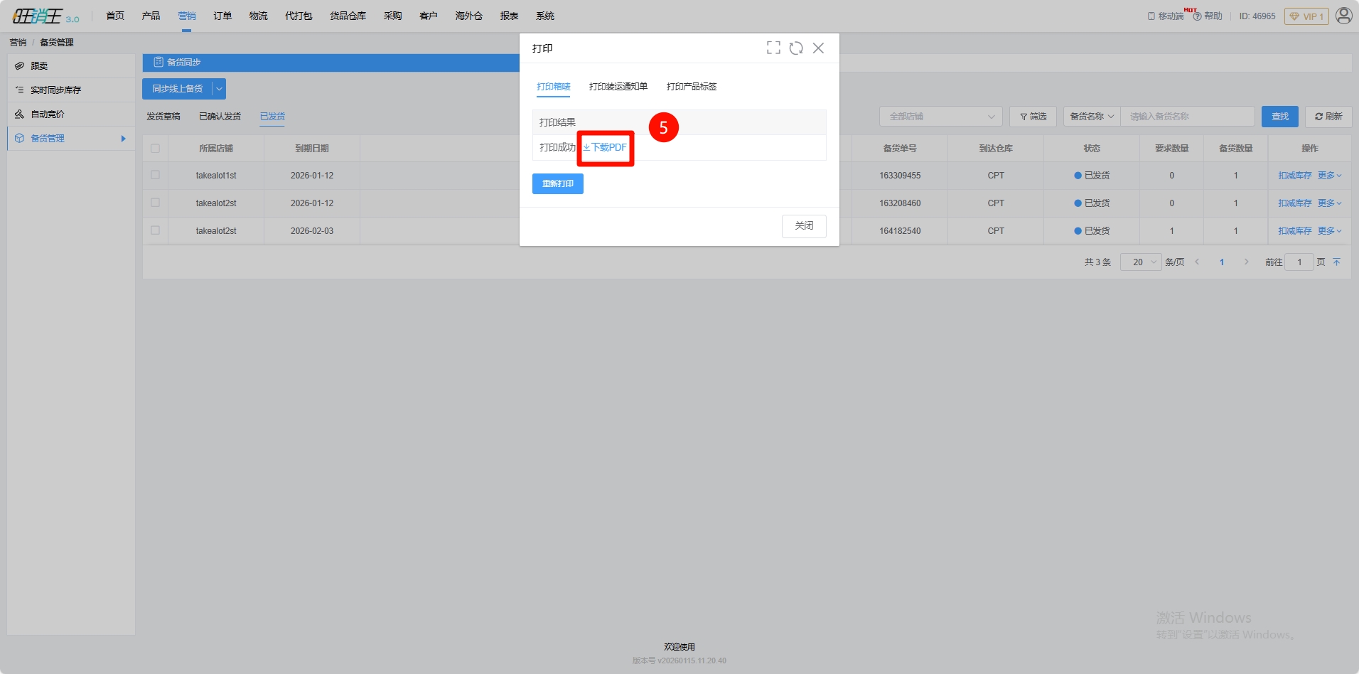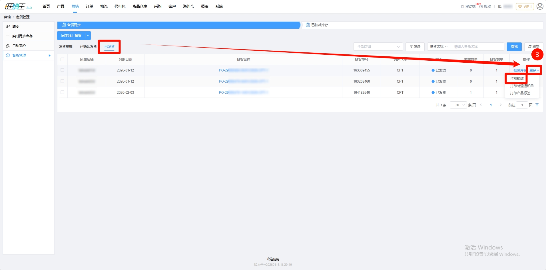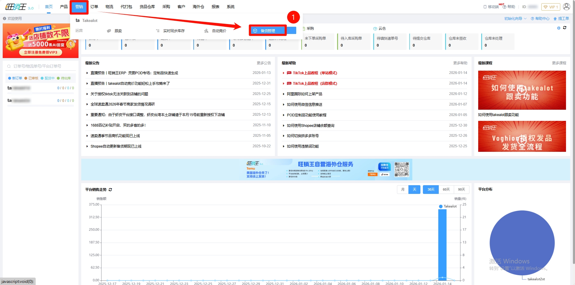 第一步:点击营销 -> 进入备货管理