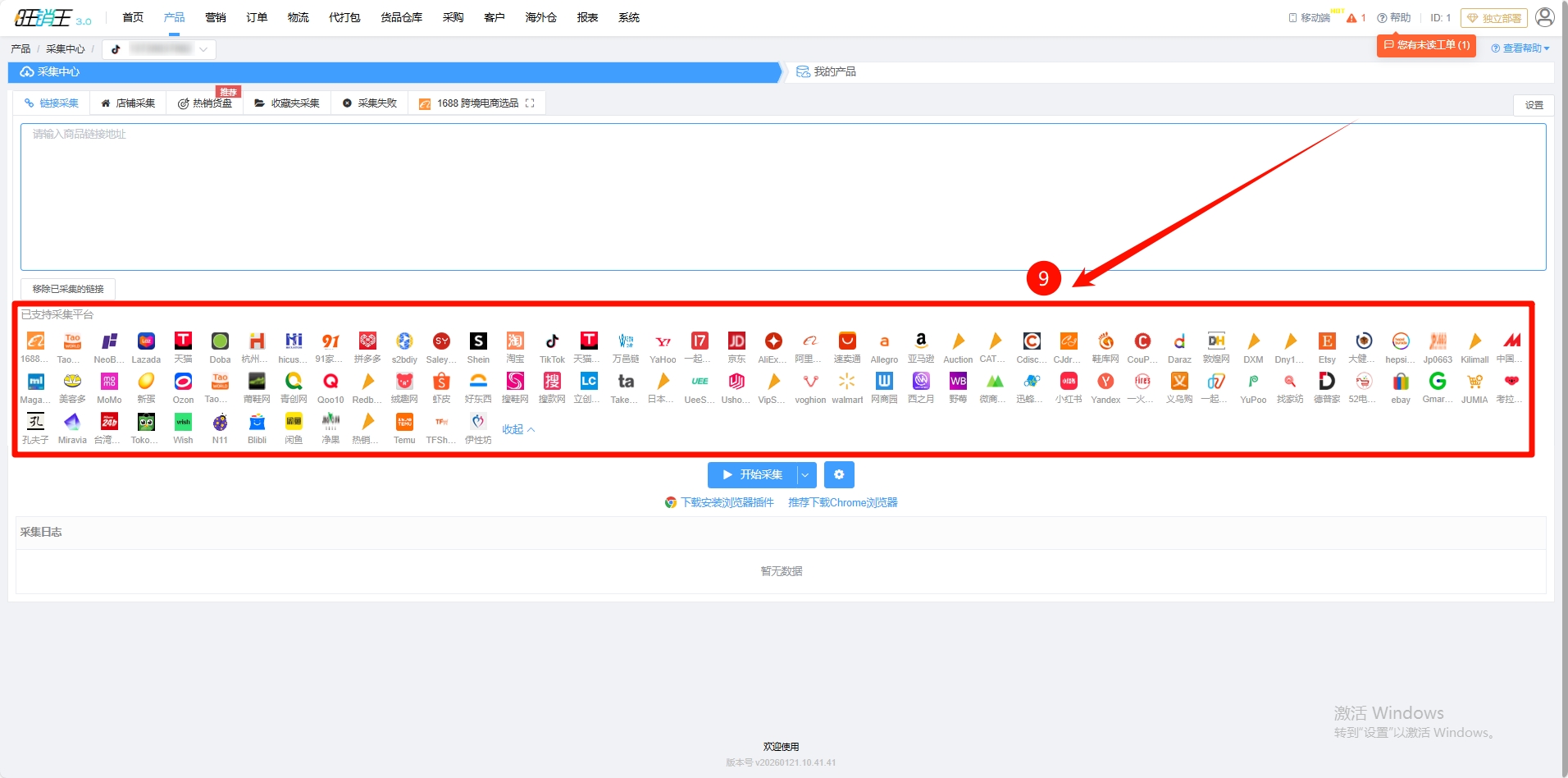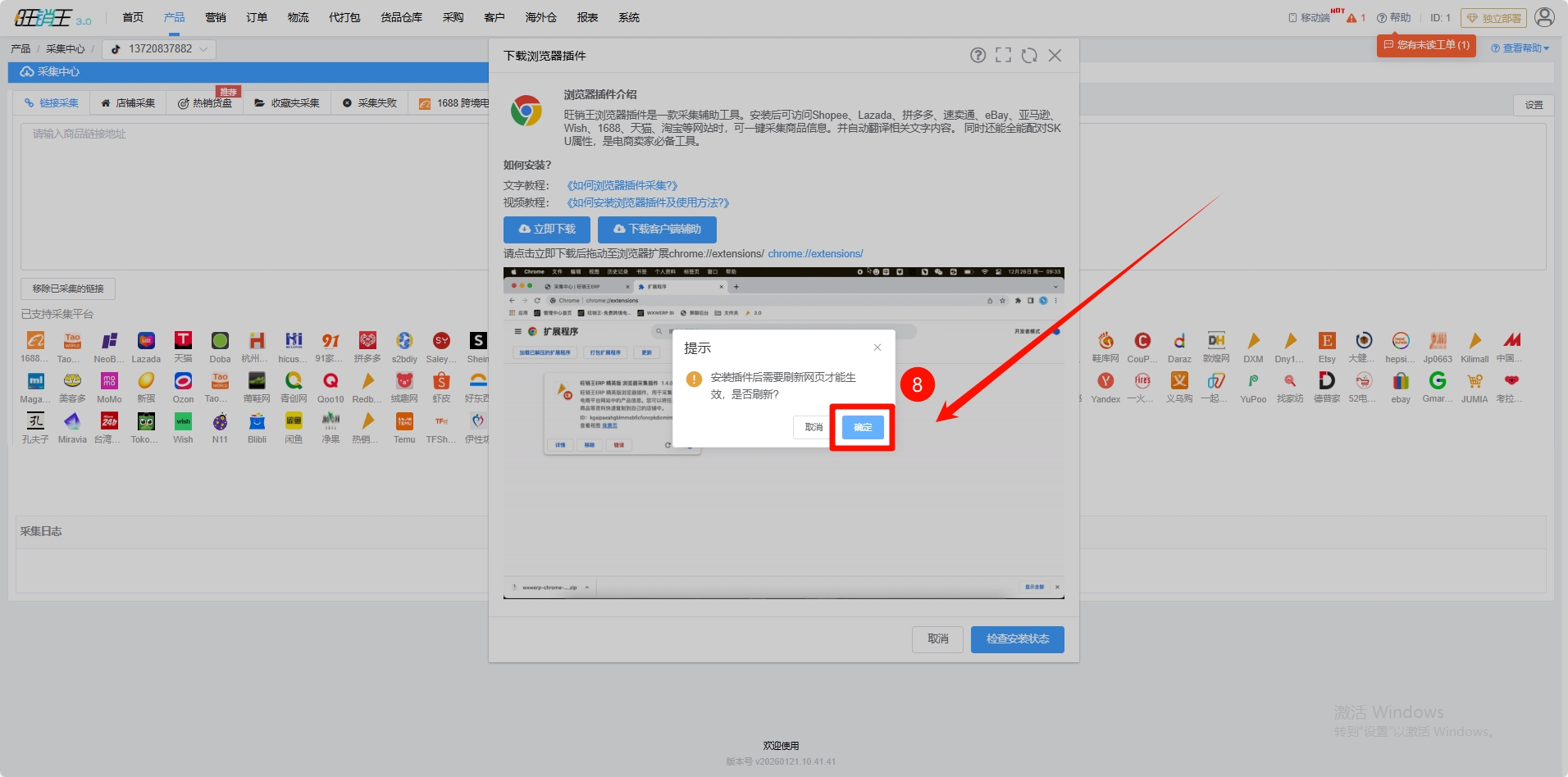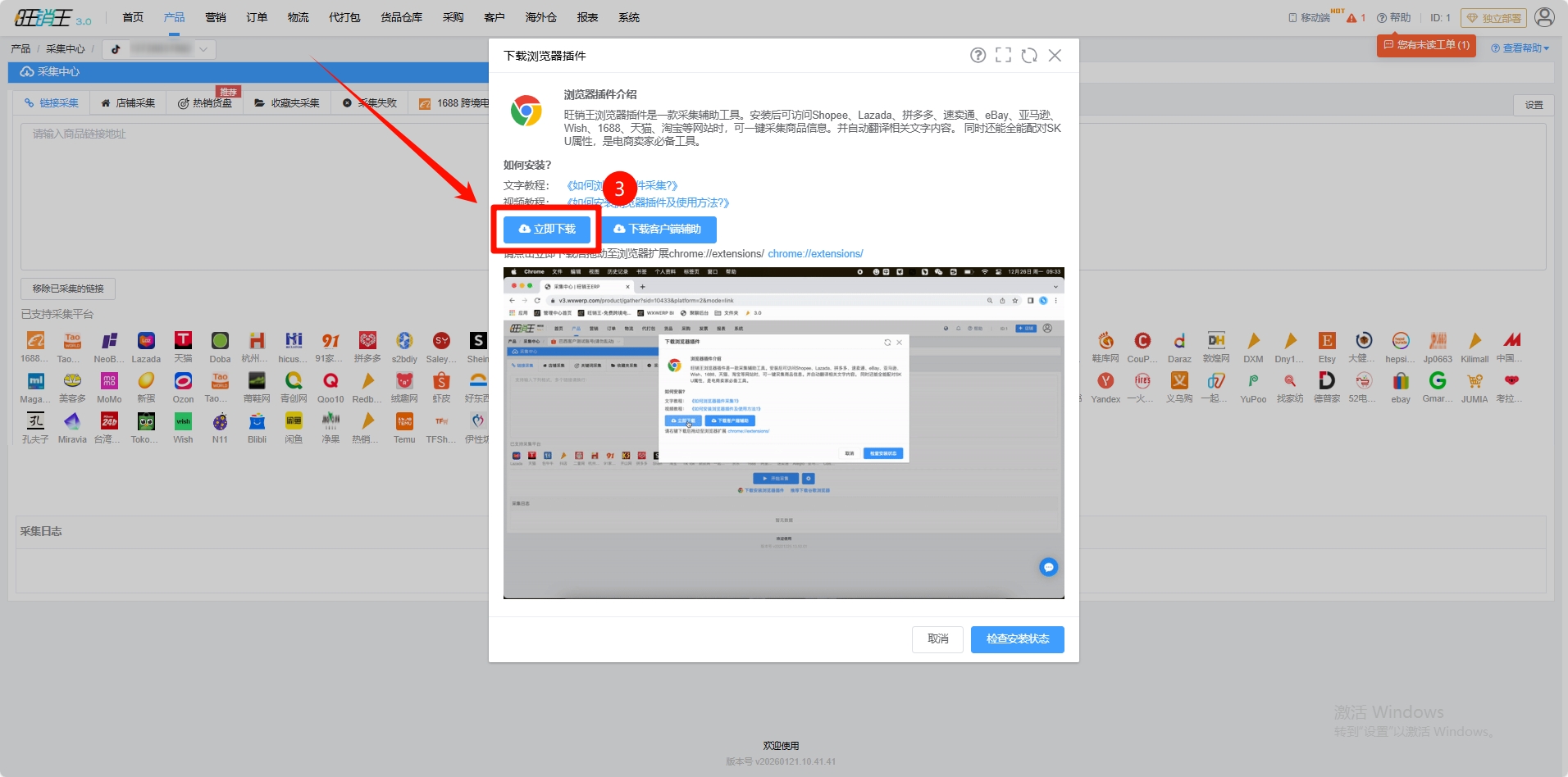 第二步:找到采集中心 -> 点击下载安装浏览器插件 (若各位商家已经安装了插件可以直接跳到第九步)