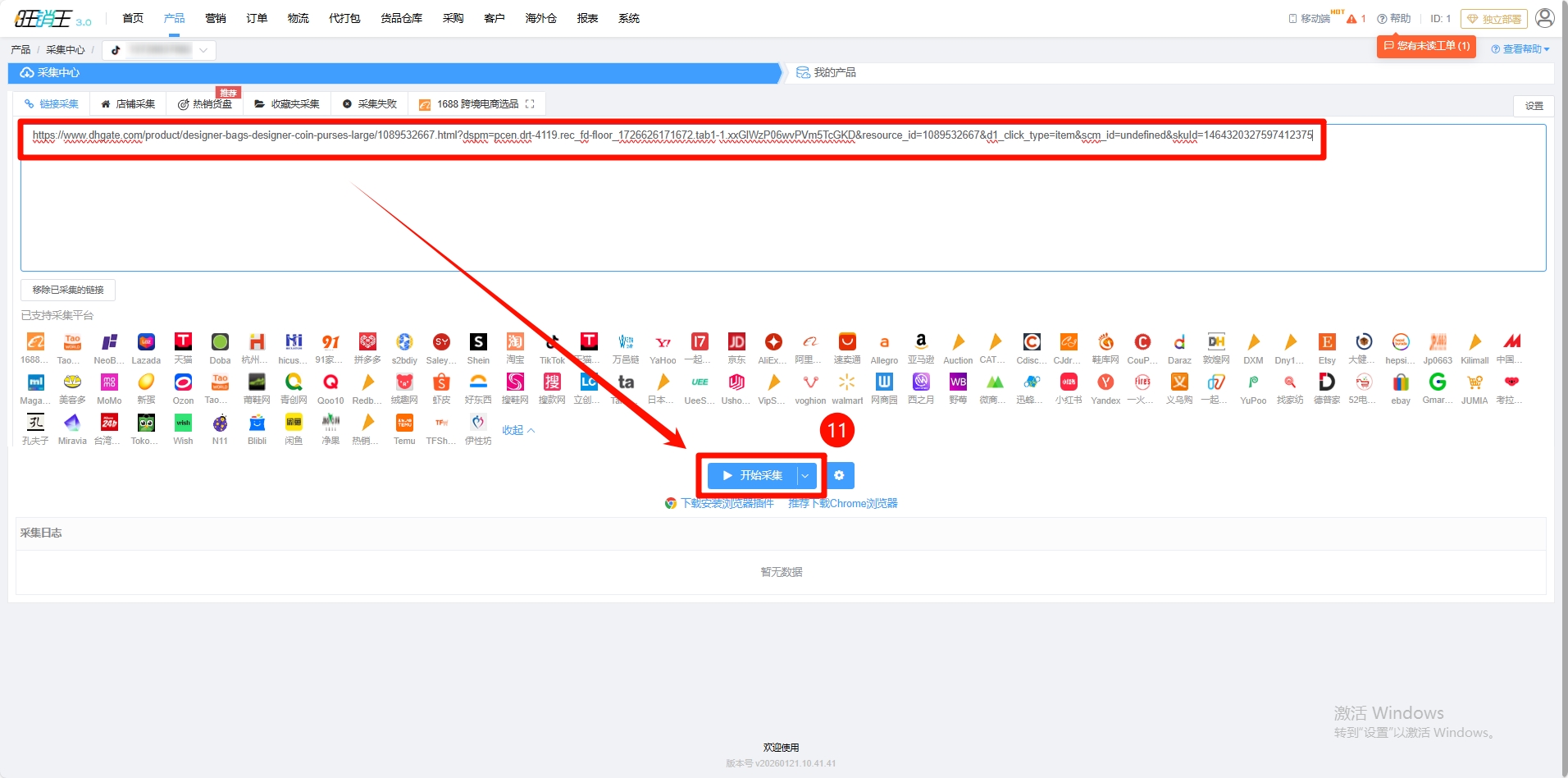 第十一步:黏贴产品链接 -> 点击开始采集