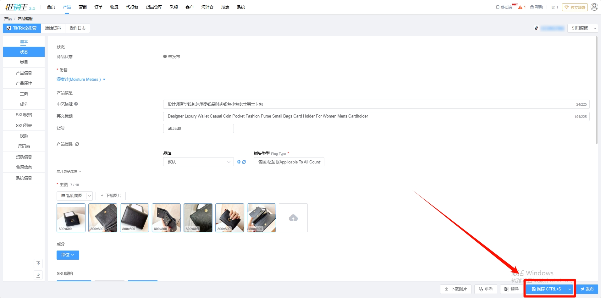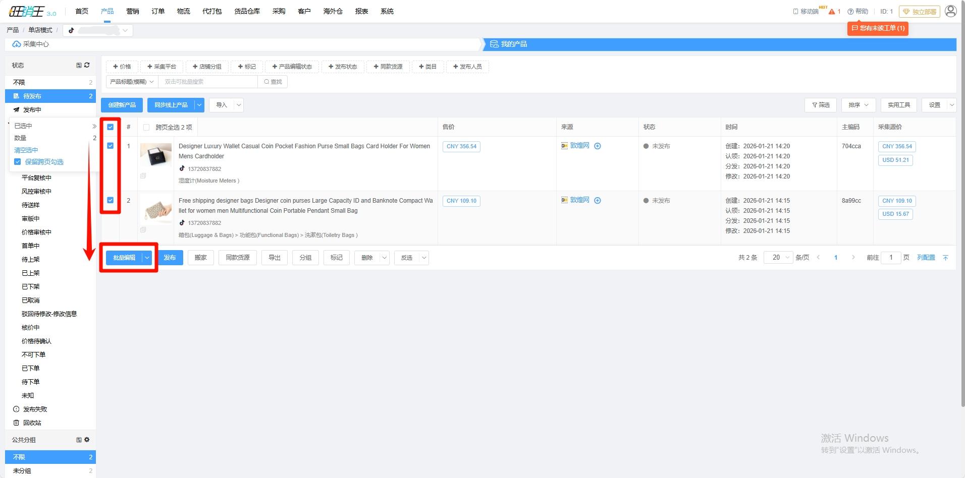 若各位商家需要批量发布产品也可以在编辑完产品后点击保存,返回待上架产品,批量勾选需要发布的产品。