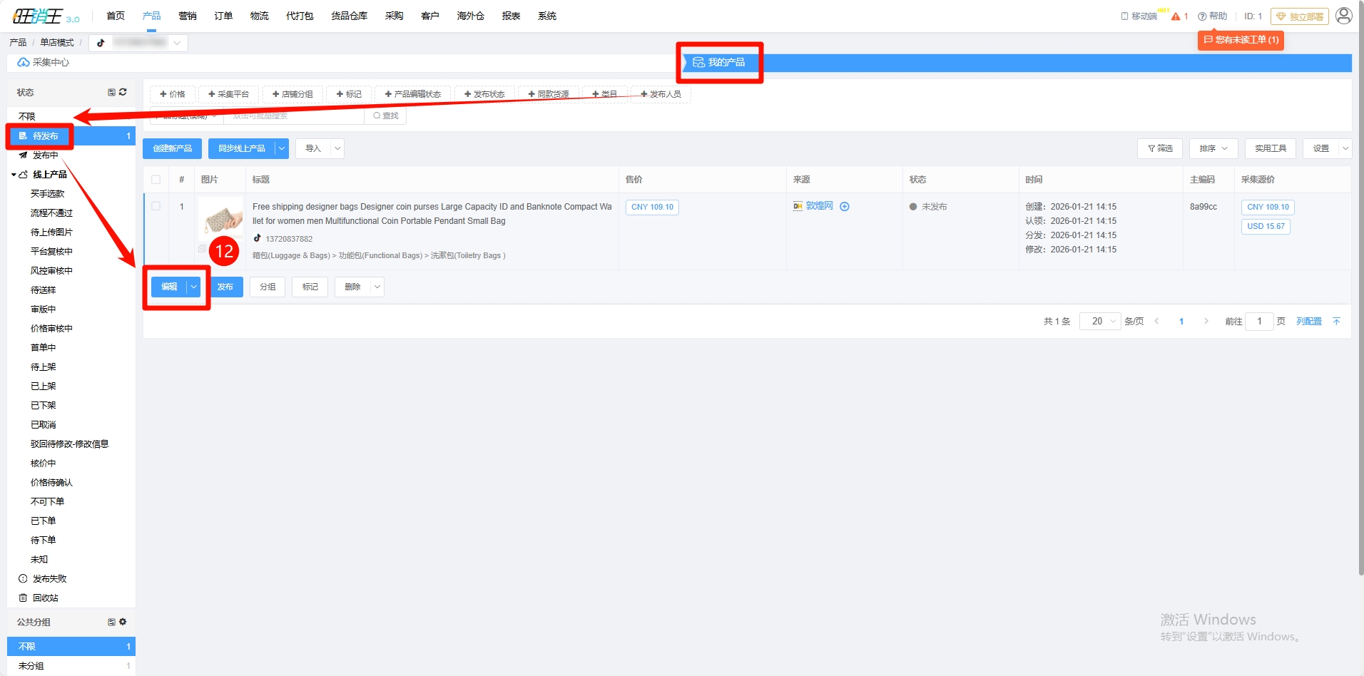 第十二步:各位商家可以直接点击查看快速进入产品编辑,或者点击产品 -> 找到待发布 -> 点击编辑