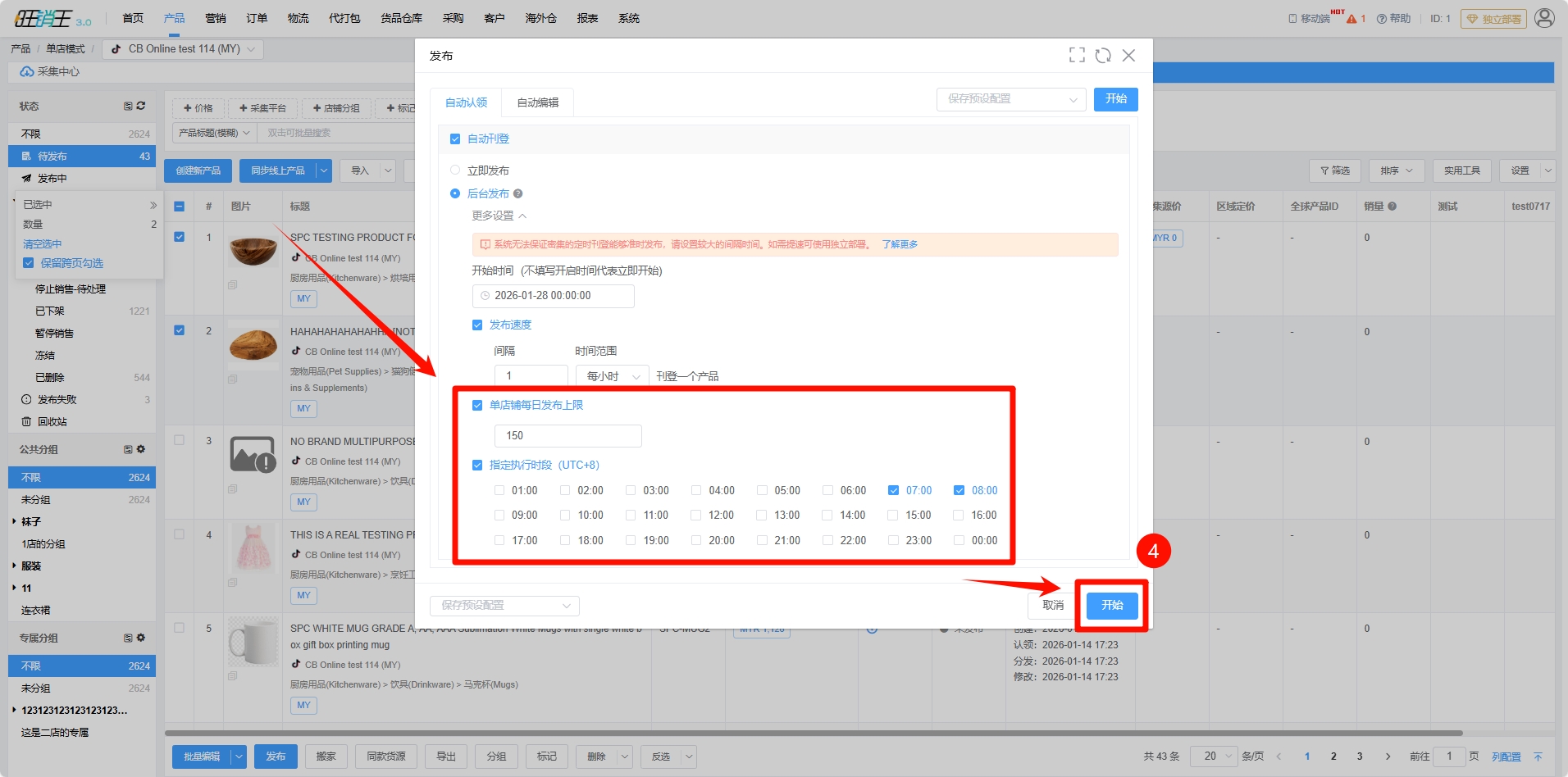 第四步:各位商家可以根据自身需求选择是否设置单店铺每日上限 -> 设置指定执行时段 -> 点击开始