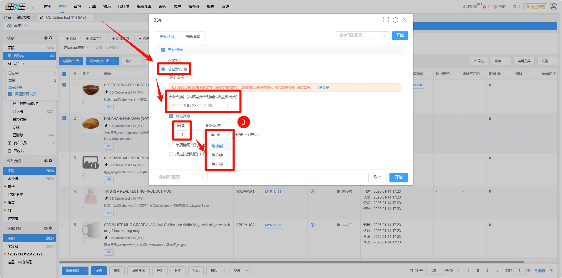 第三步:选择定时发布 -> 选择后台发布的开始时间 -> 各位商家可以根据自身需求选择发布速度以及间隔的时间范围