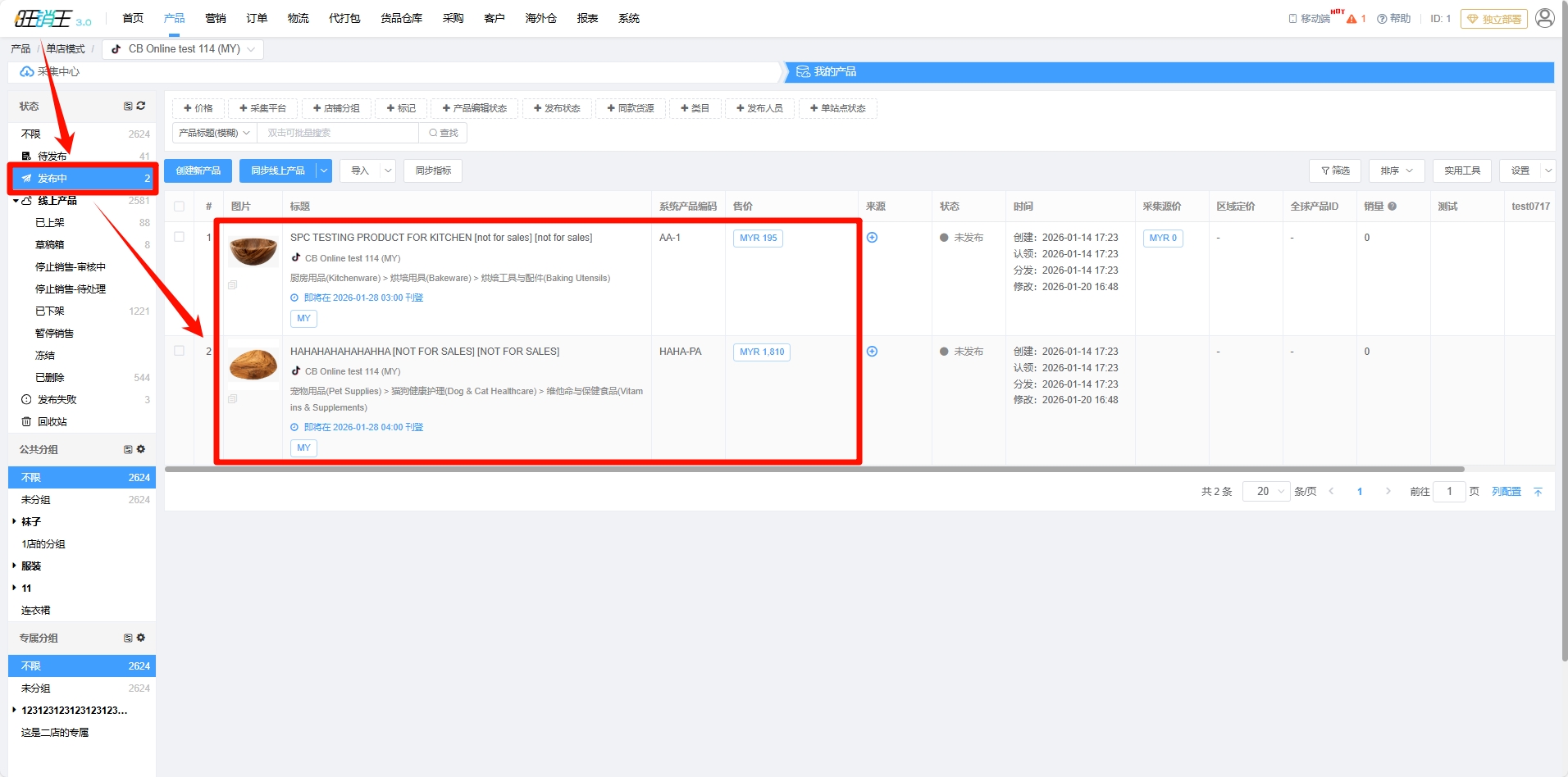 选择定时发布后,对应的产品将进入【发布中】,各位商家可以点击左侧【发布中】进行查看。