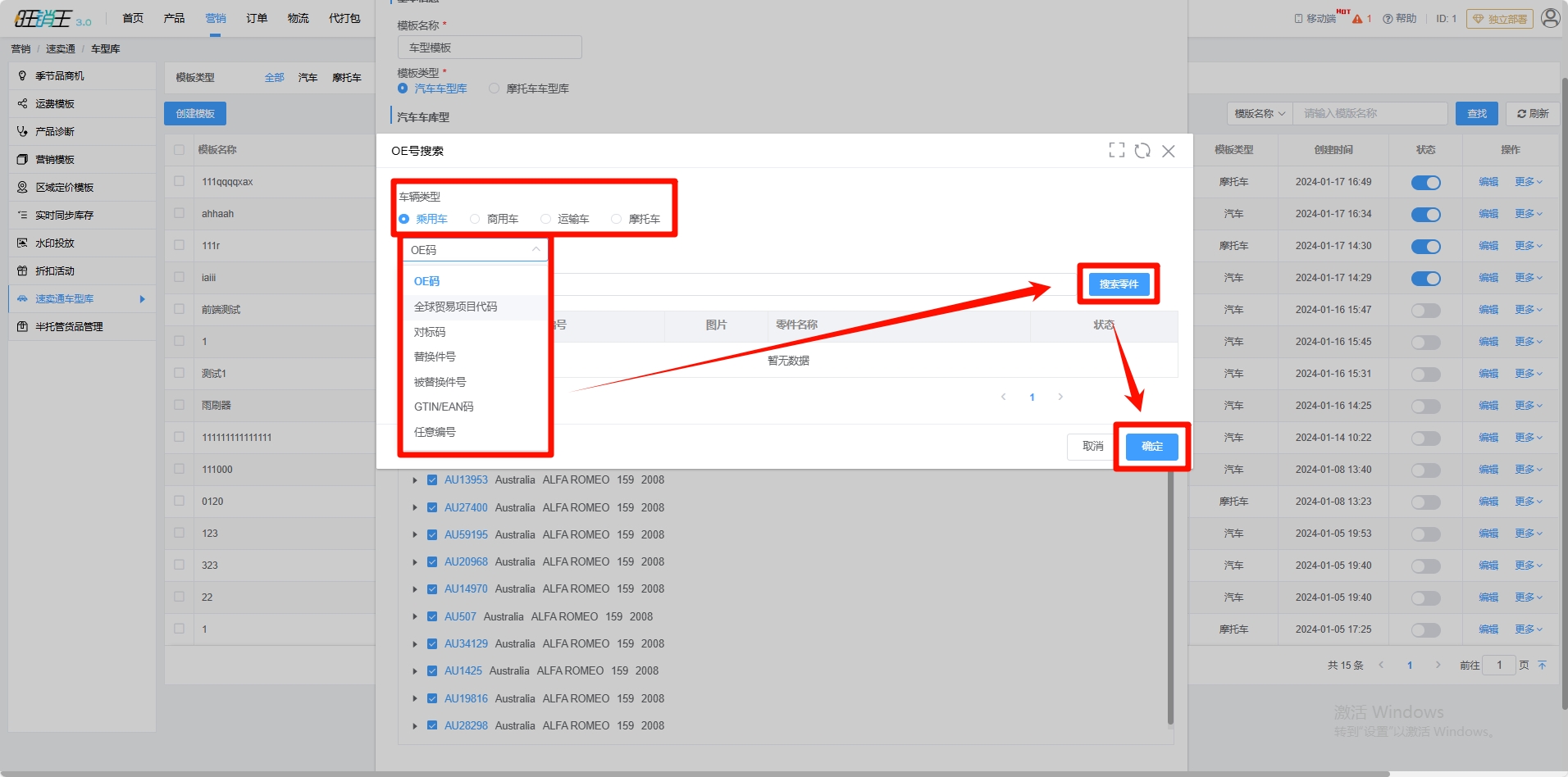 各位商家选择车辆类型,再选择具体的搜索方式,点击搜索零件再点击确定即可进行精准添加