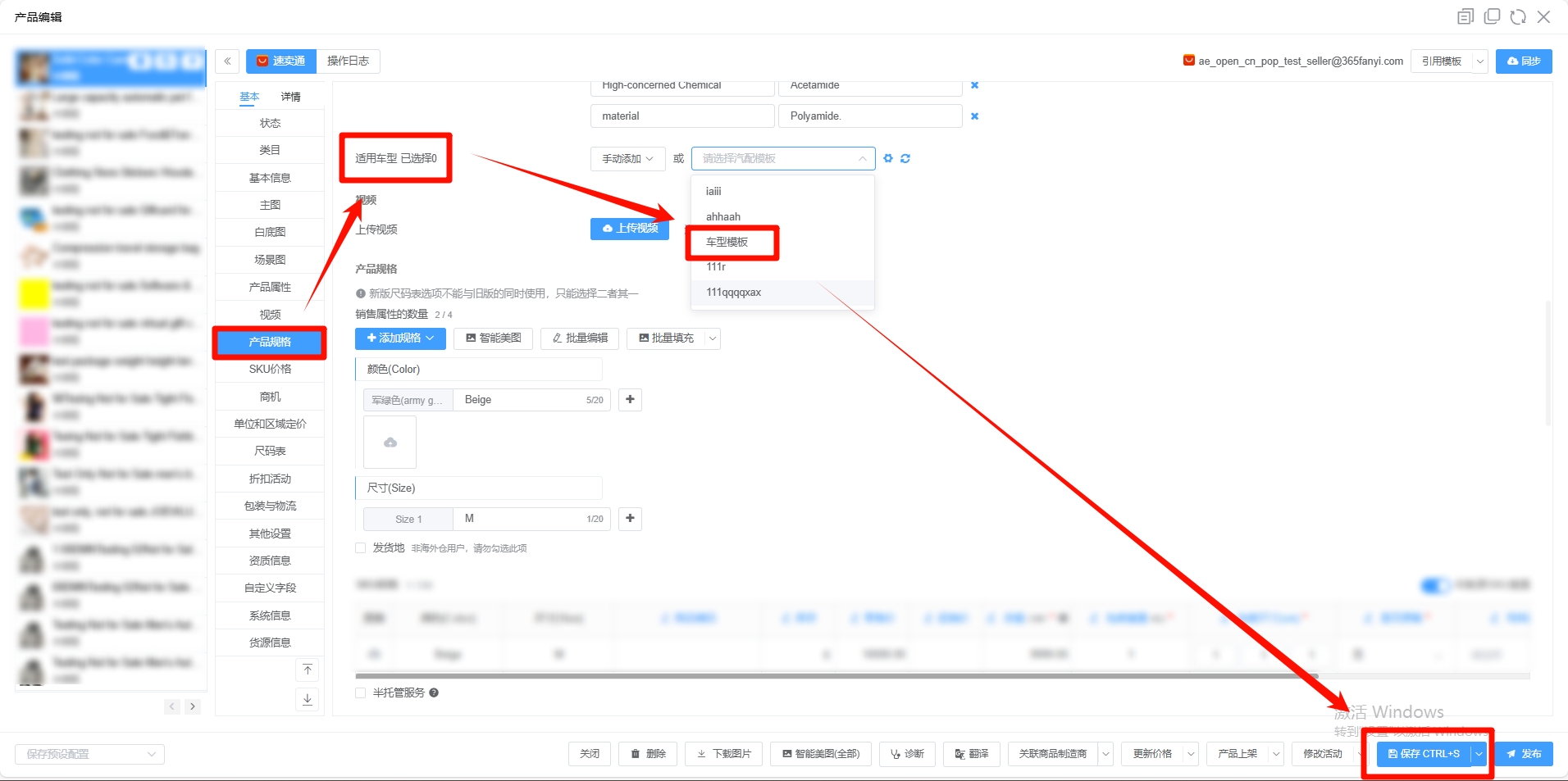 各位商家进入产品编辑页面,点击产品规格 -> 选择刚才创建的模板 -> 点击右下角保存