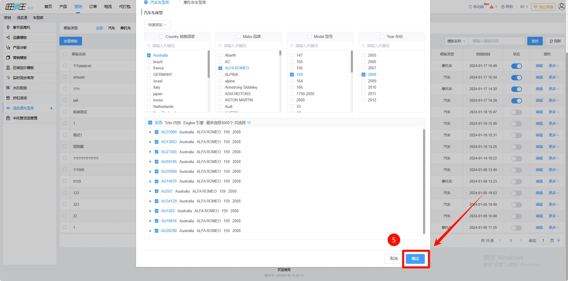 第四步:各位商家根据产品以此选择对应销售国家、品牌、型号、年份,及内饰与引擎