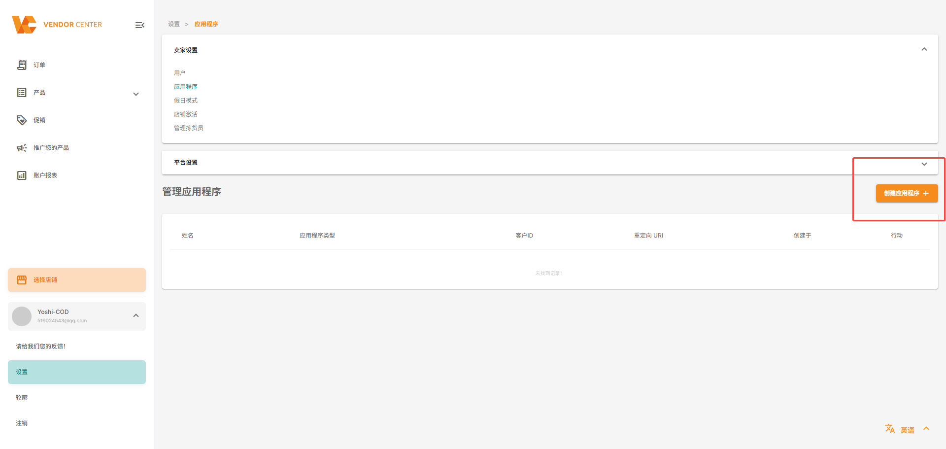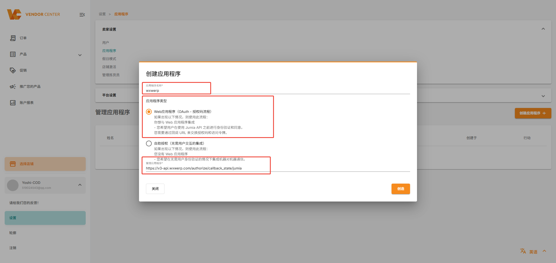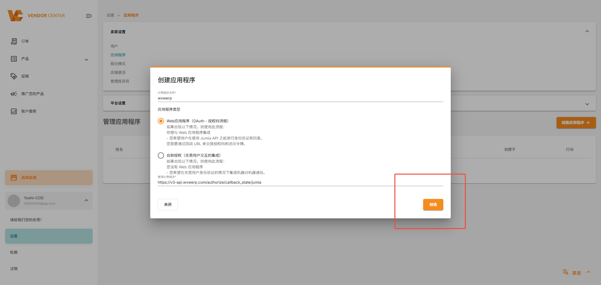 第三步:【登入jumia店铺后台 点击设置创建应用程序】