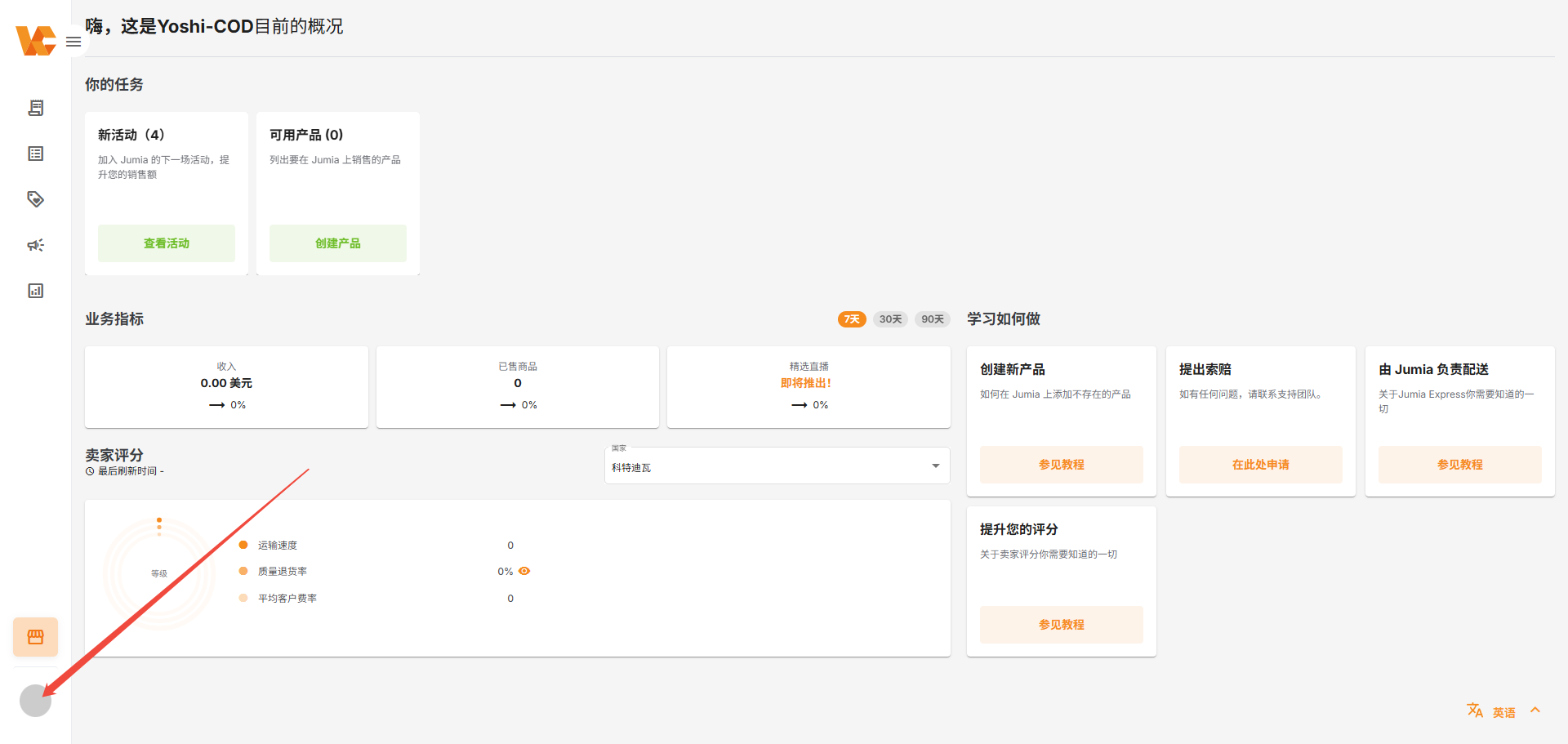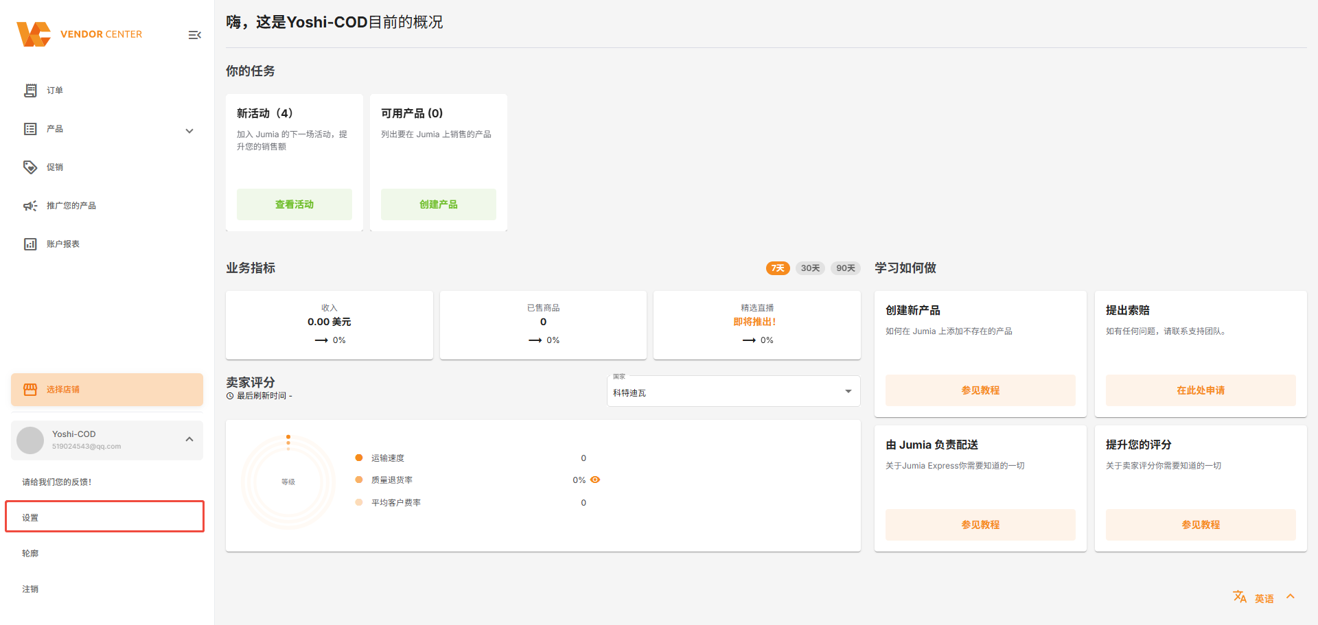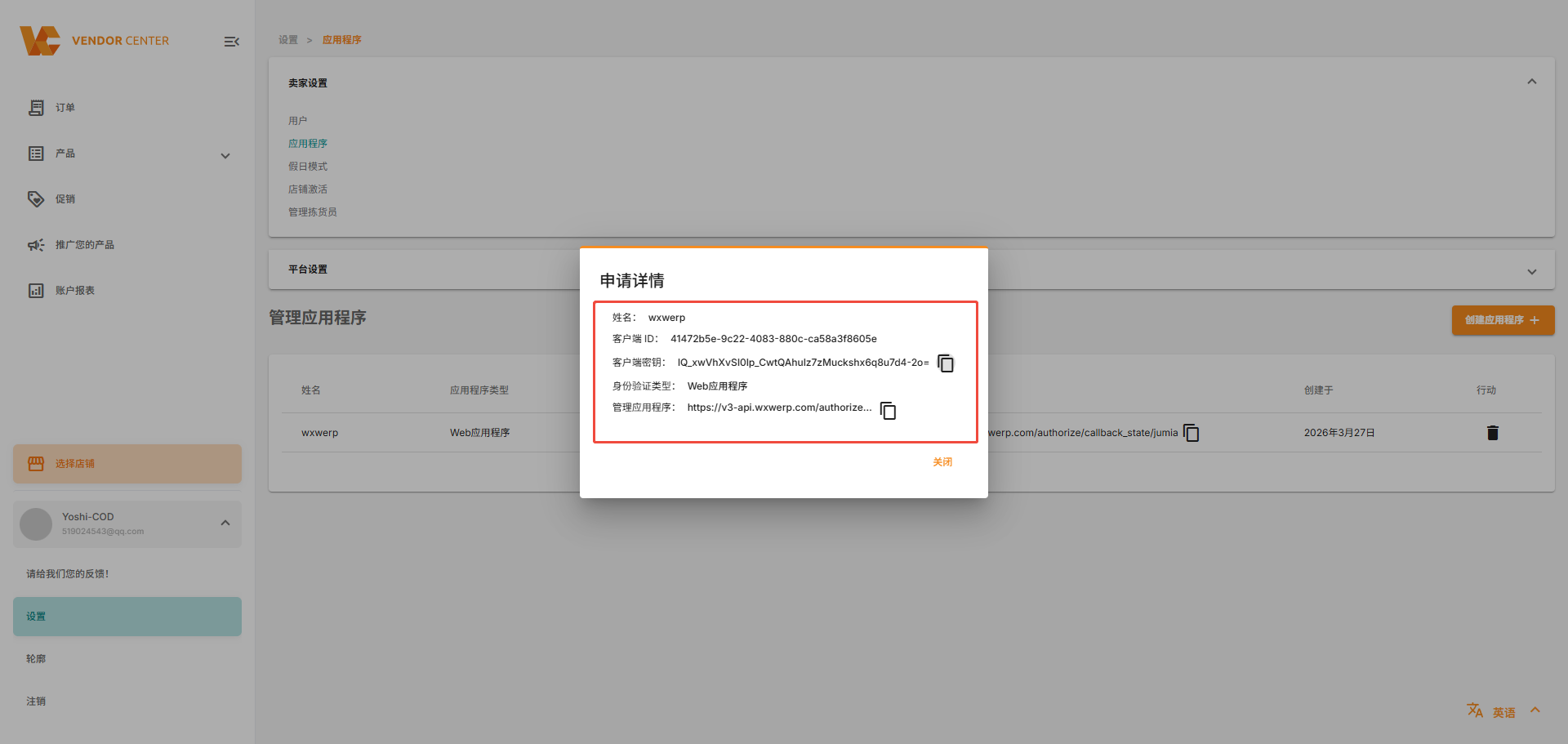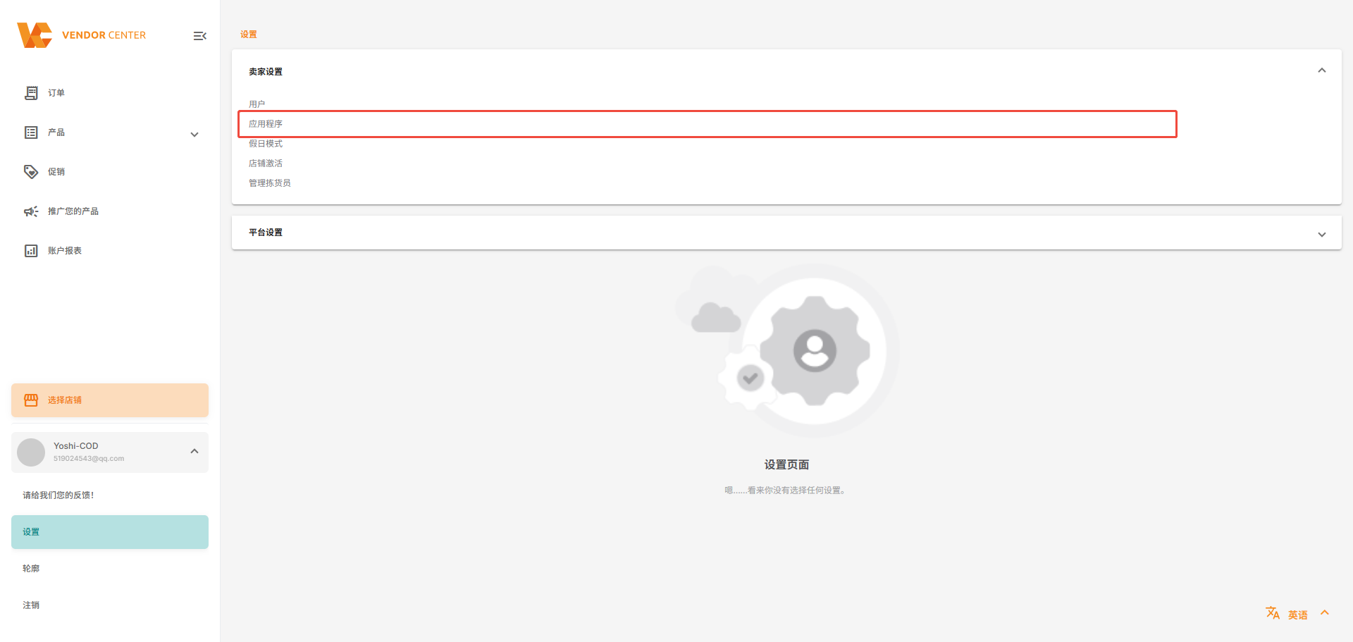 第三步:【登入jumia店铺后台 点击设置创建应用程序】