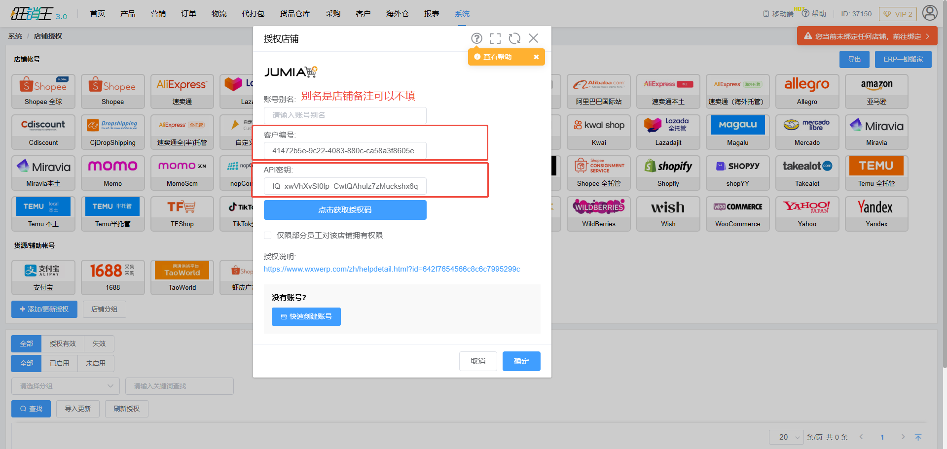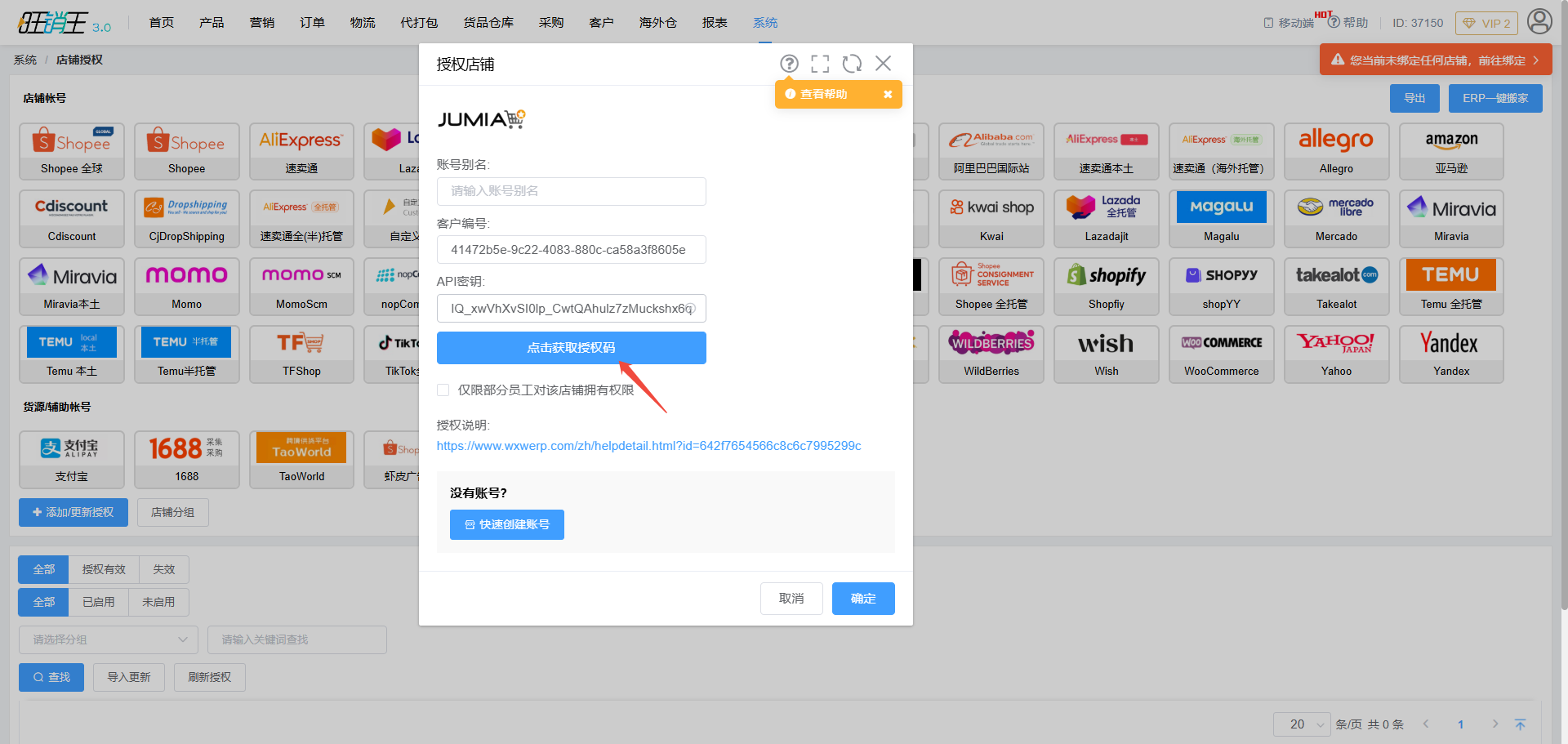 第六步:【将获得的ID和API秘钥两串字符复制粘贴单旺销王的客户编号和API秘钥框内后点击获取授权码】