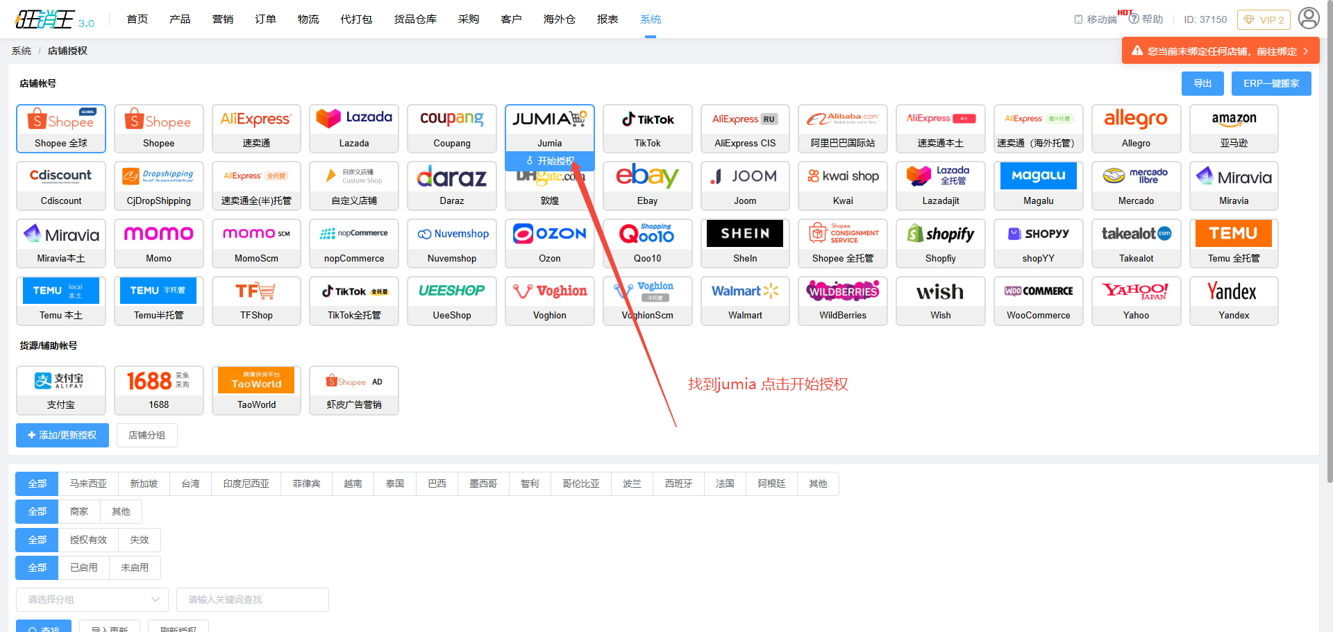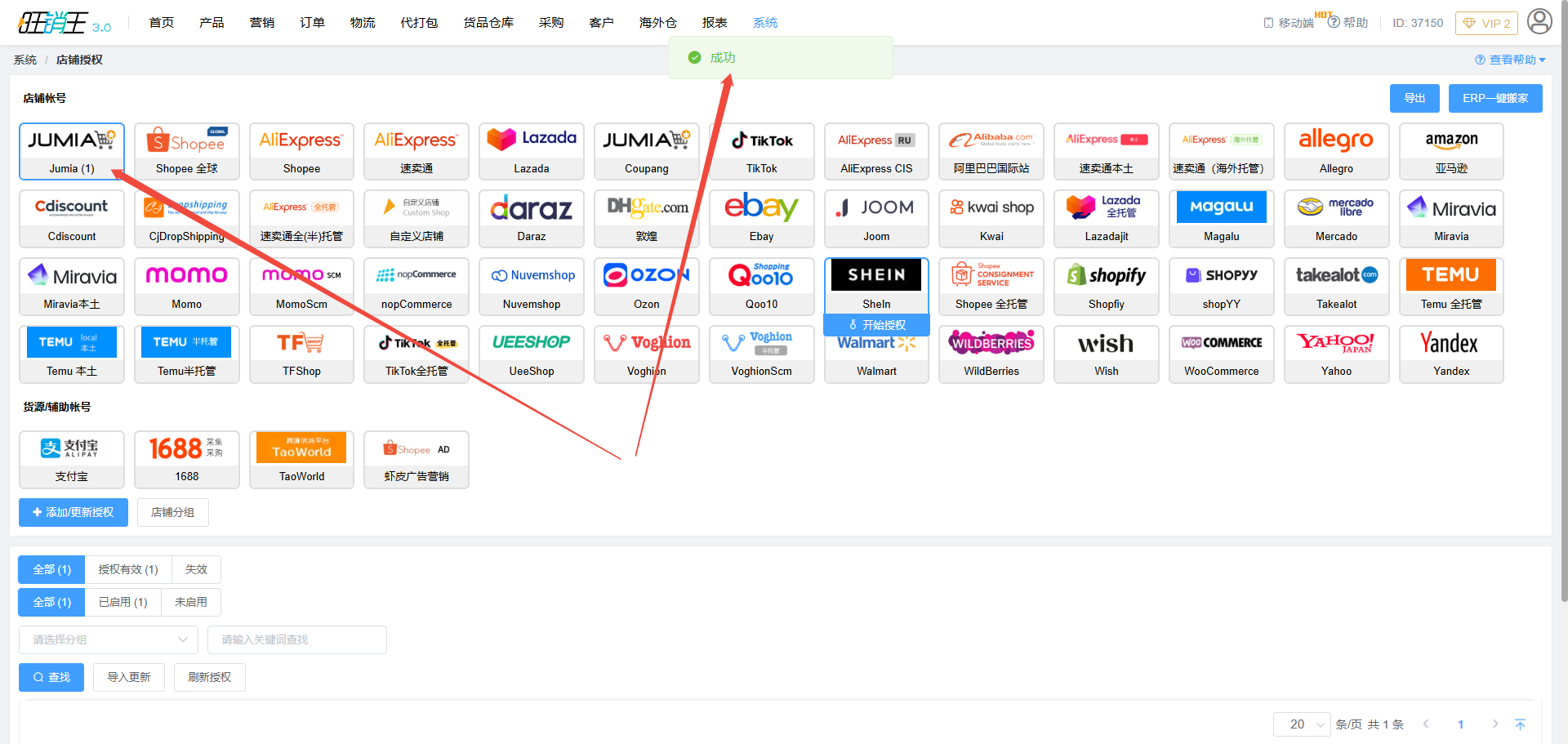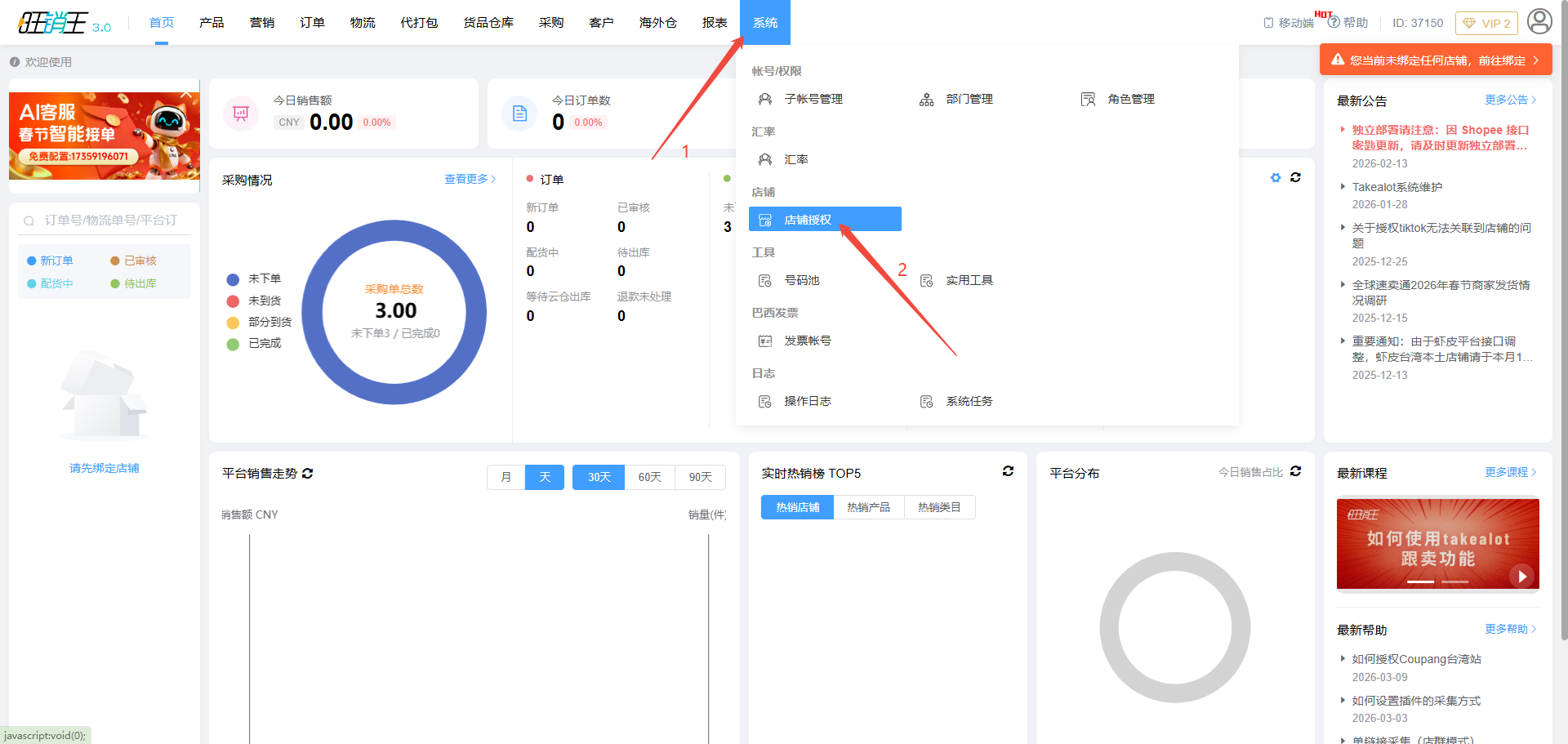 第一步:【登入旺销王,点击系统-选择店铺授权】